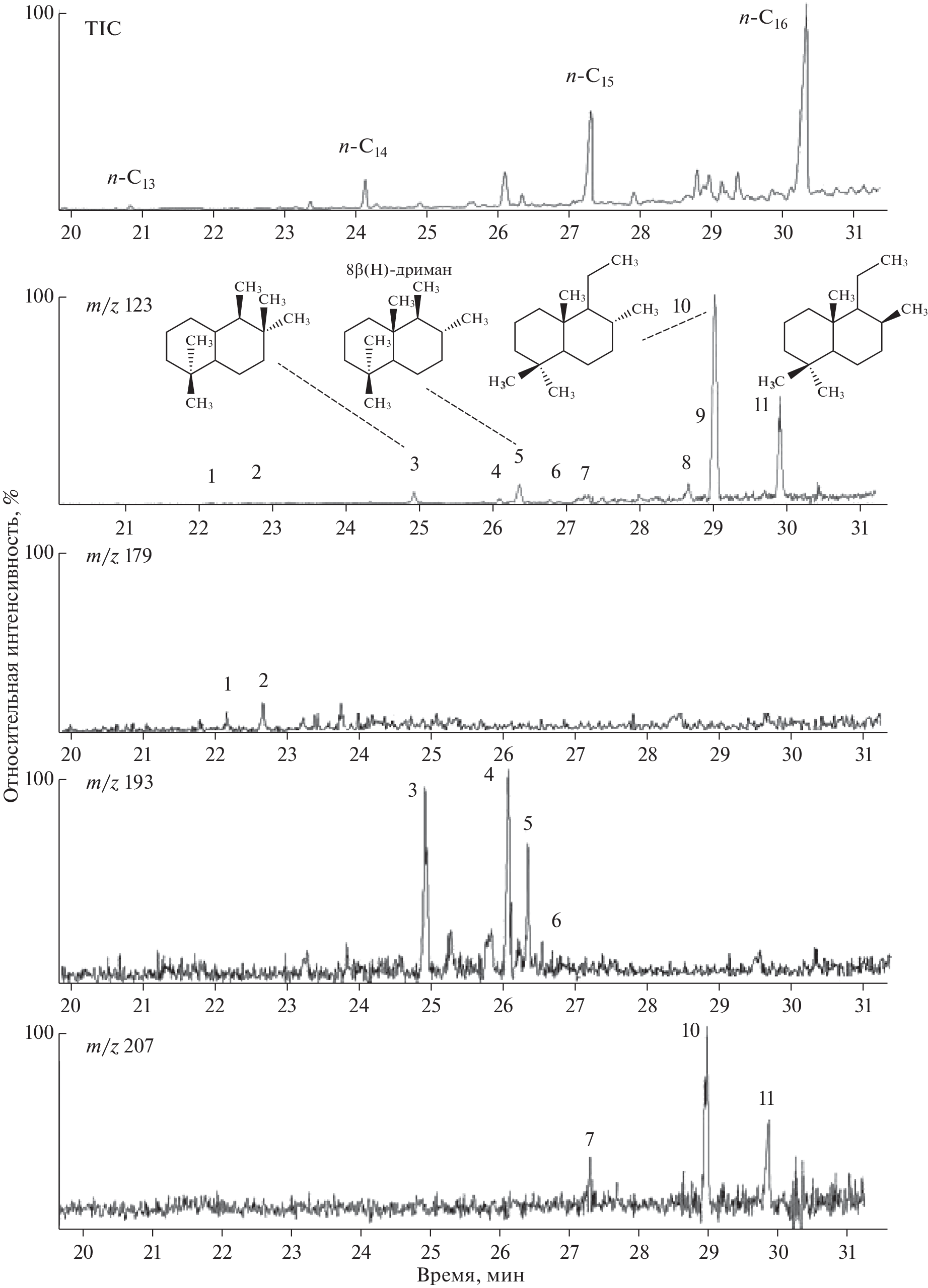 Методом газовой хромато-масс-спектрометрии изучены состав и относительное содержание бициклических сесквитерпанов состава С14–С16 в нефтепроявлениях термальных источников кальдеры влк. Узон. Показано, что в составе нефти преобладают С16 гомодриманы, содержание С15 дриманов незначительно, С14 нордриманы присутствуют в следовых количествах. Обнаружен гомодриман с биологической конфигурацией 8α(Н). Бициклические сесквитерпаны узонской нефти, вероятно, являются его производными. Выявлено, что с ростом термической зрелости нефти увеличивается относительное содержание С15 дриманов. Предложен сесквитерпановый индекс зрелости, который ранее не применялся в органической геохимии.