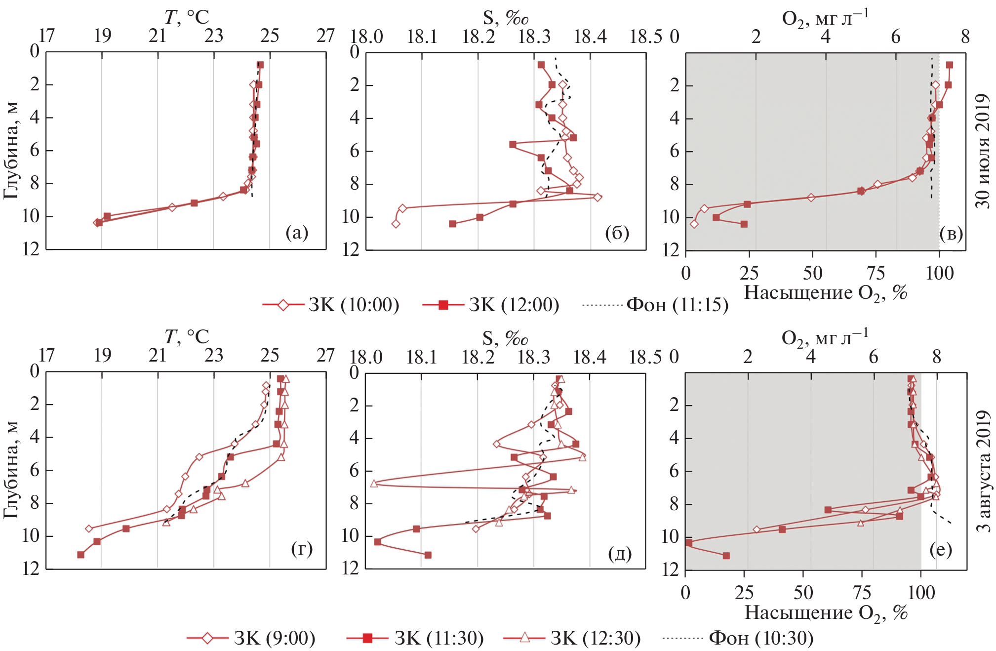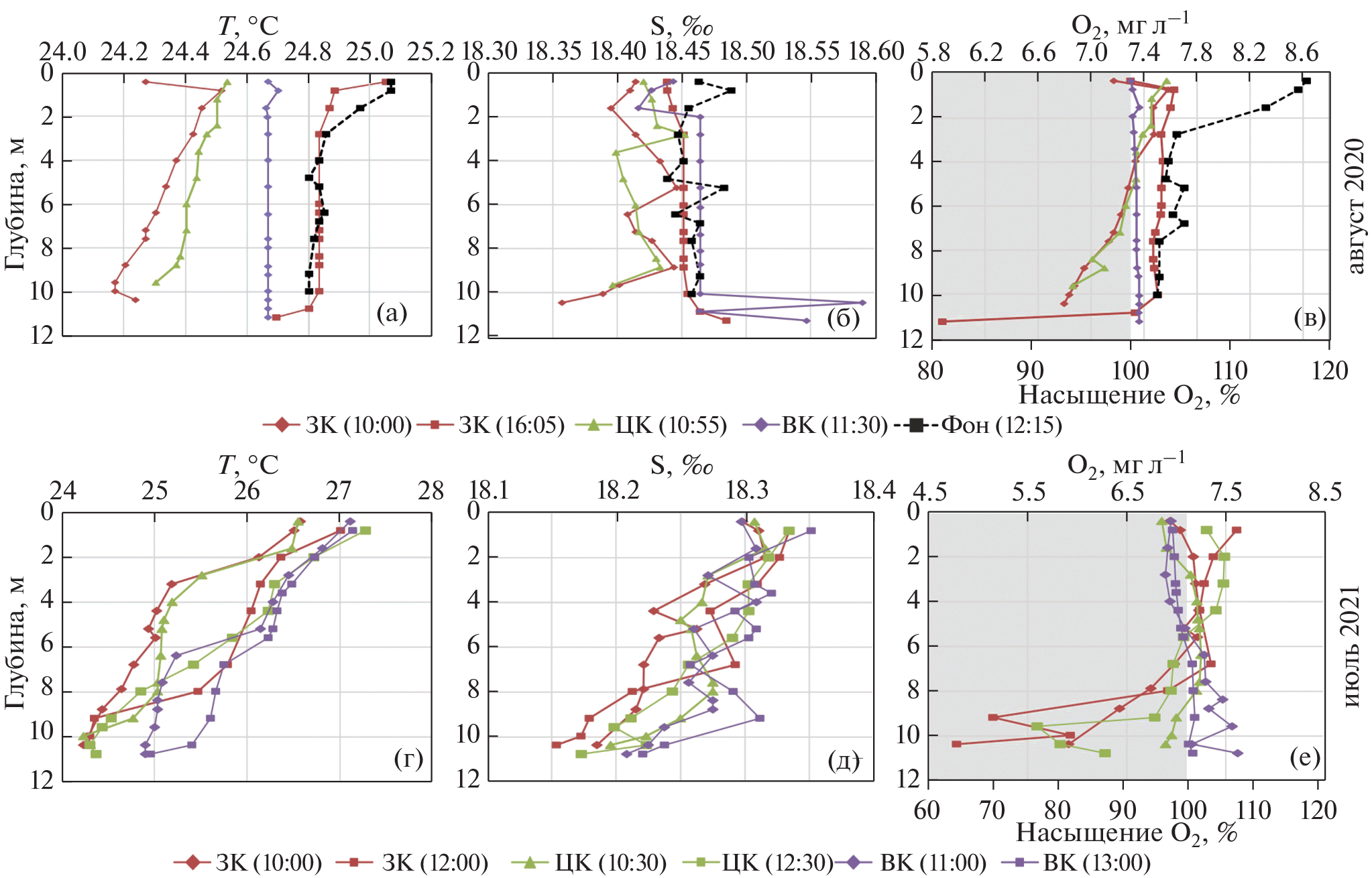 Gas seep and fluid flows from the seabed are an environment-forming factor of the aquatic environment, mainly due to their influence on the dissolved gases in the water, including dissolved oxygen. During the summer seasons from 2019 to 2021 in the area of shallow water gas emission site off the southern coast of the Heracles Peninsula, series of vertical probing profiles were carried out to determine hydrological parameters of the water: dissolved oxygen concentration (O2), temperature (T), salinity (S), and flow velocity (U). The study area is an underwater ledge with faults in the form of three canyons composed of dense limestones, two of which contained bubble gas emissions. Significant variability in O2 was identified in canyons where gas emissions are observed: from 1 to 80% saturation in the bottom layer, in contrast to normoxia at the background sites. Hypoxia was observed in the bottom layer above the emission sites in the absence of turbulence at temperature stratification. The values S decreased with depth, and the maximum difference reached 0.4‰. The bubble gas was dominated by methane (68.5–75.5%), and the carbon isotope composition of the bubble methane gas varied from –67.9 to –59.8‰ VPDB in 2019 and 2020, respectively. This generally indicates that the CH4 is of predominantly microbial genesis, was formed under different conditions, and matured in various periods of research during the monitoring period. Bacterial mats (mostly sulfur-oxidizing bacteria) were found in the areas of gas emissions.