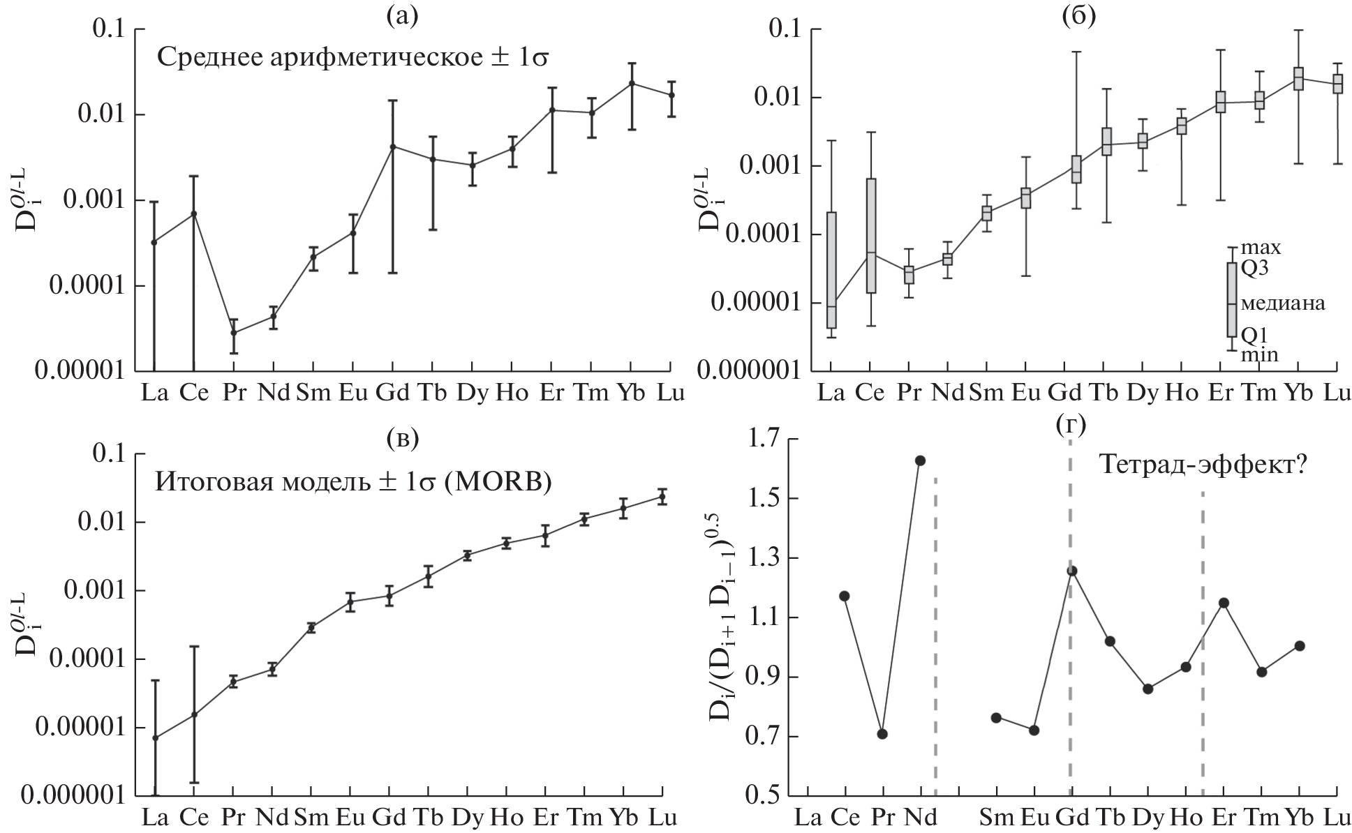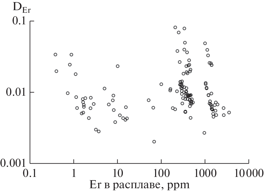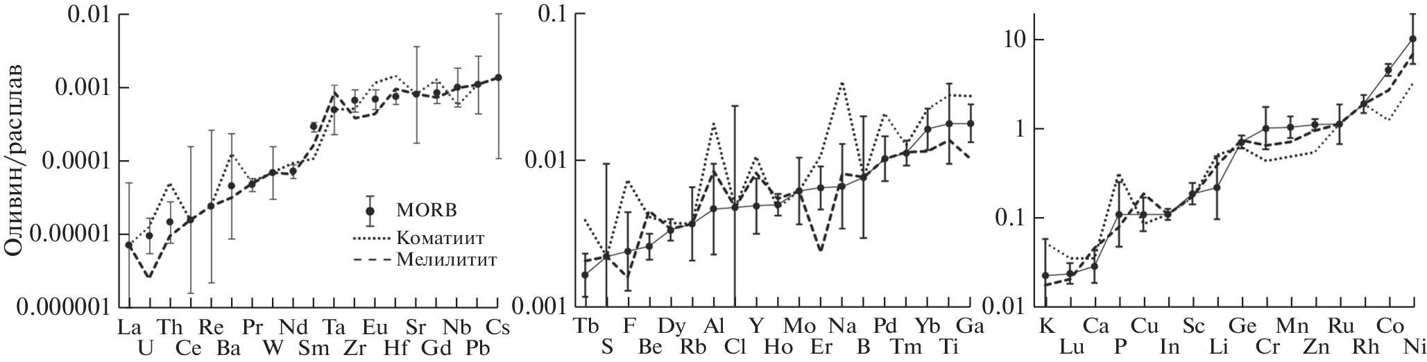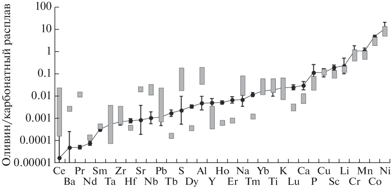 Knowledge of mineral–melt partition coefficients (D) is necessary for geochemical modeling of magma formation and evolution. The main source of these parameters is experiments on equilibrium between minerals and silicate melt. The database on mineral–melt equilibrium experiments has grown continuously, which allows one to refine partition coefficients and reveal the most important factors affecting them. This paper reports the analysis of available experimental data on trace element partitioning between olivine and melt (7000 experiments from 587 publications were used). Based on the statistical processing of the data array, the dependence of D on melt and olivine composition and P–T conditions was evaluated. It was found that most of incompatible elements are either insensitive or moderately sensitive to these parameters. Among the compositional parameters, CaO content in melt is most significant. It was shown that D estimates can be significantly improved by using ratios of D values for different elements. Such ratios are often independent of experimental parameters and much less variable than D values for particular elements. The obtained D estimates for basaltic compositions vary within six orders of magnitude, from <10–5 (U, Th, and La) to ~5–10 (Co and Ni). The low D values for most elements (<0.1) indicate that many trace element ratios in melts do not change significantly even at high degrees of olivine crystallization. The obtained estimates were compared with data on element partitioning between high-pressure (Mg,Fe)2SiO4 phases (wadsleyite and ringwoodite) and silicate melt and between olivine and carbonate–silicate melts. In both cases, there is a close similarity to element partitioning between olivine and silicate melt. One exception is REE. DREE values for the wadsleyite/ringwoodite–melt and olivine–carbonate melt systems are approximately one order of magnitude lower than those for olivine–silicate melt partitioning.