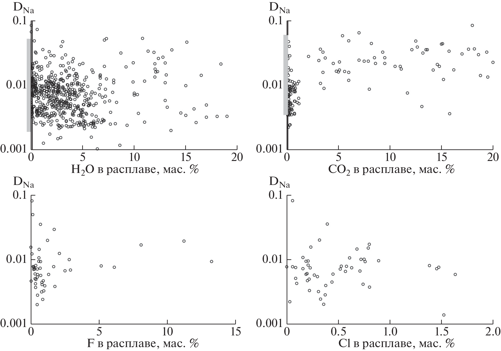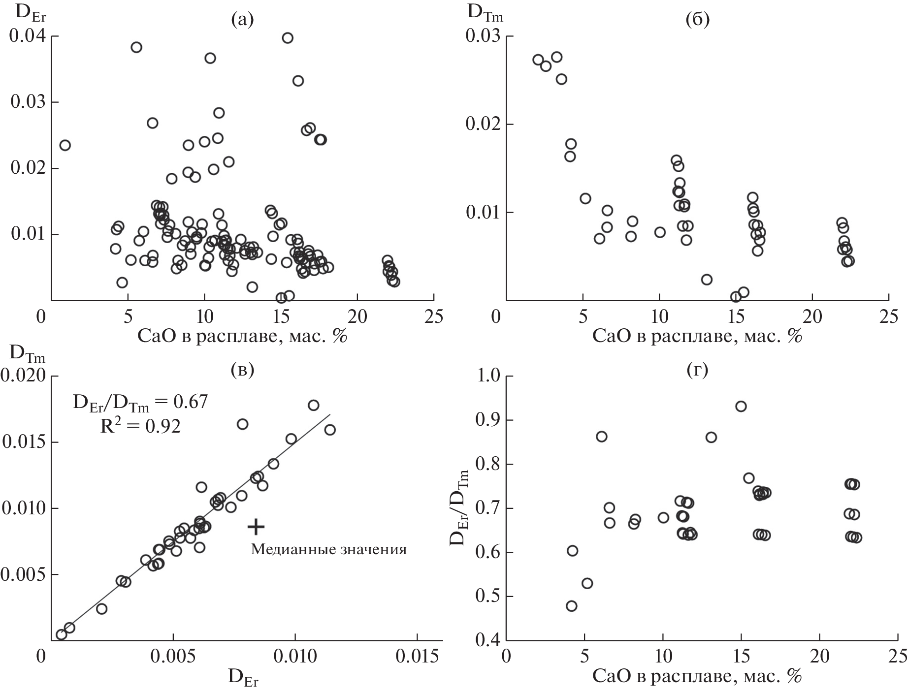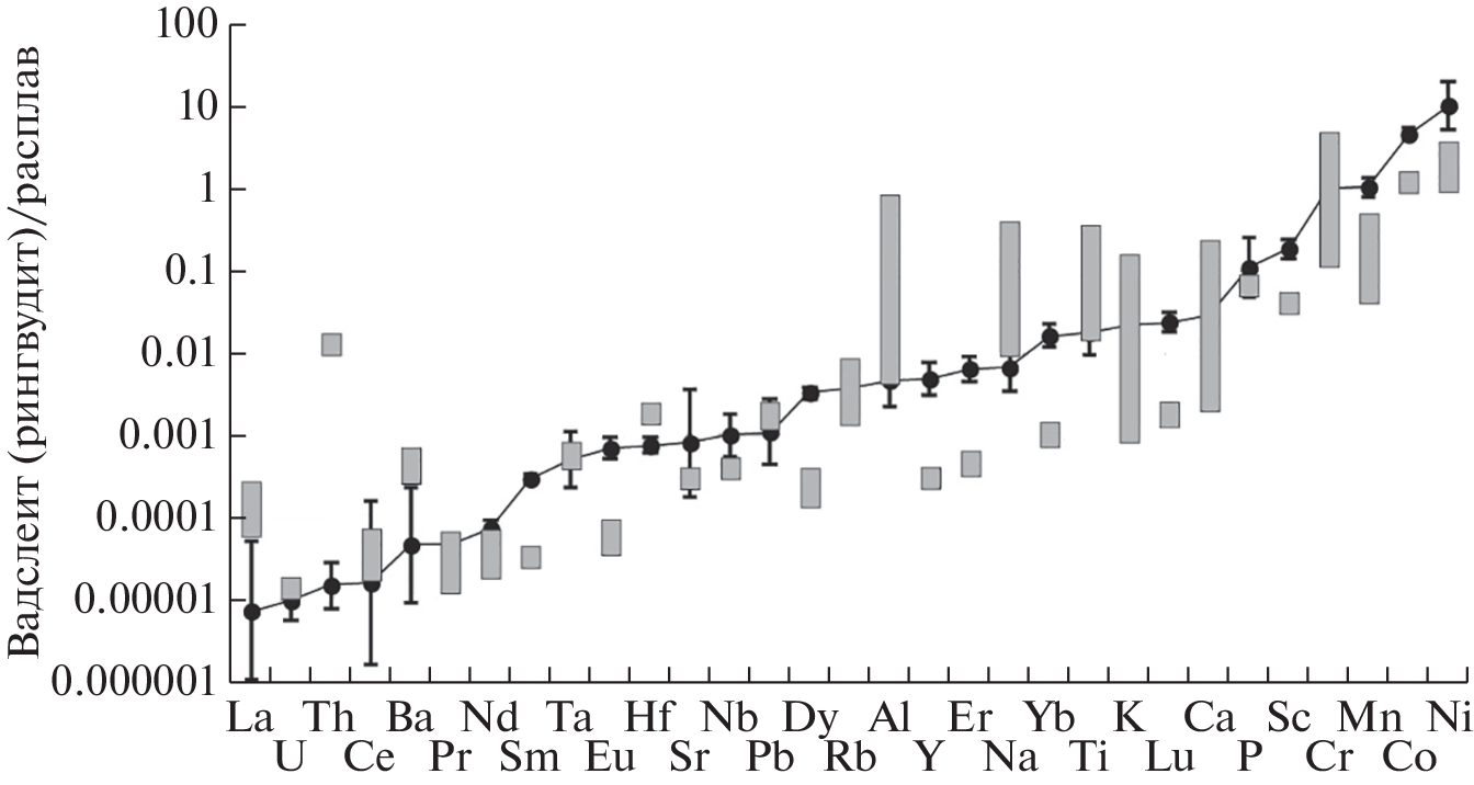 Knowledge of mineral–melt partition coefficients (D) is necessary for geochemical modeling of magma formation and evolution. The main source of these parameters is experiments on equilibrium between minerals and silicate melt. The database on mineral–melt equilibrium experiments has grown continuously, which allows one to refine partition coefficients and reveal the most important factors affecting them. This paper reports the analysis of available experimental data on trace element partitioning between olivine and melt (7000 experiments from 587 publications were used). Based on the statistical processing of the data array, the dependence of D on melt and olivine composition and P–T conditions was evaluated. It was found that most of incompatible elements are either insensitive or moderately sensitive to these parameters. Among the compositional parameters, CaO content in melt is most significant. It was shown that D estimates can be significantly improved by using ratios of D values for different elements. Such ratios are often independent of experimental parameters and much less variable than D values for particular elements. The obtained D estimates for basaltic compositions vary within six orders of magnitude, from <10–5 (U, Th, and La) to ~5–10 (Co and Ni). The low D values for most elements (<0.1) indicate that many trace element ratios in melts do not change significantly even at high degrees of olivine crystallization. The obtained estimates were compared with data on element partitioning between high-pressure (Mg,Fe)2SiO4 phases (wadsleyite and ringwoodite) and silicate melt and between olivine and carbonate–silicate melts. In both cases, there is a close similarity to element partitioning between olivine and silicate melt. One exception is REE. DREE values for the wadsleyite/ringwoodite–melt and olivine–carbonate melt systems are approximately one order of magnitude lower than those for olivine–silicate melt partitioning.