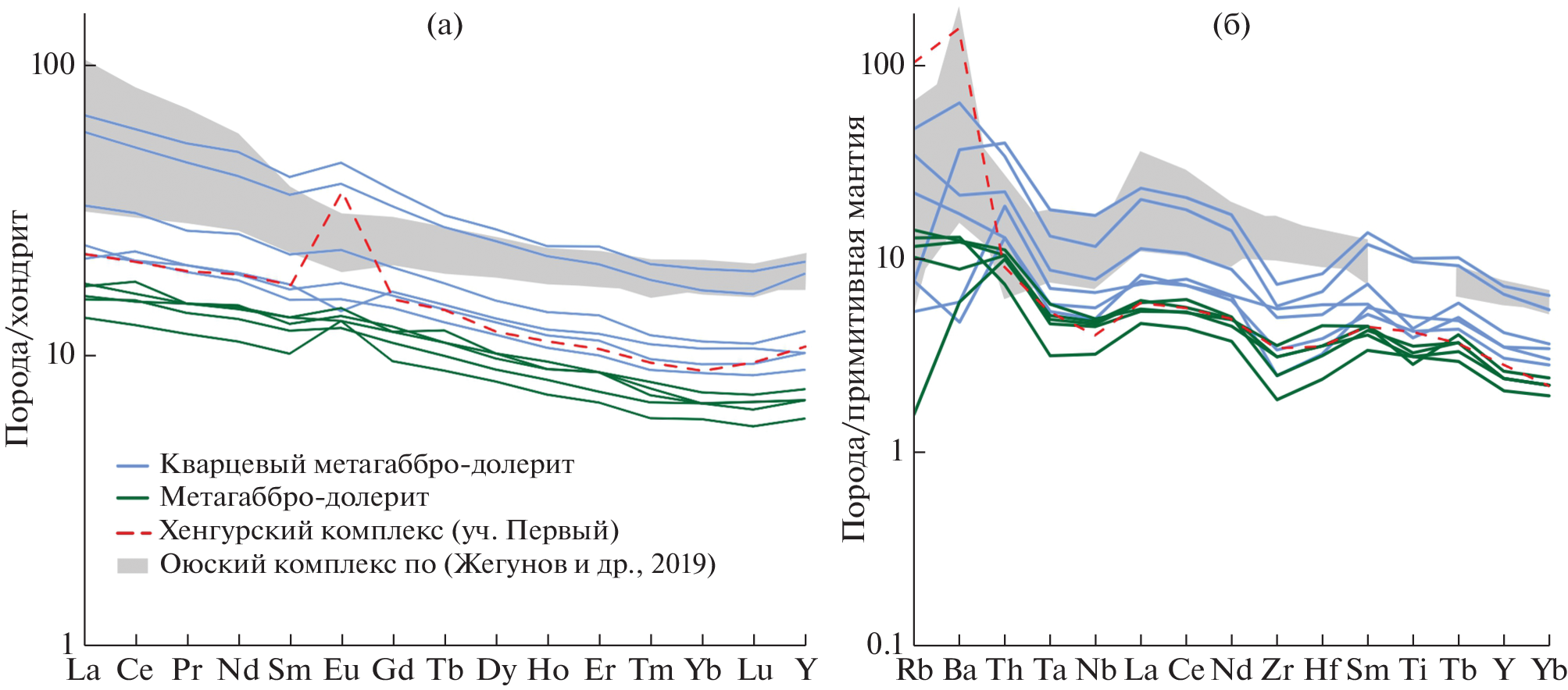 The paper presents results of petrographic, geochemical, mineralogical, and isotope-geochronological studies of metagabbro-dolerites of the central part of the Kara Depression, located in the middle course of the Sopcha-Yu River in the Yugorsky Peninsula, Nenets Autonomous District, Russia. Two varieties of metagabbro-dolerites are distinguished: quartz-bearing and quartz-free. The influence of an impact event on rock-forming and accessory minerals is considered. It is proved that the impact event has not modified the isotope system of zircon in the metagabbro-dolerites. The U–Pb (LA-ICP-MS) isotope–geochronological dating of the zircons gives an age of the magmatic minerals within the range of 365.3 to 390.8 Ma, which seems to correspond to the age of the massif. The weighted mean age is 375.5 ± 2.6 Ma and likely corresponds to the age of the Hengur complex.