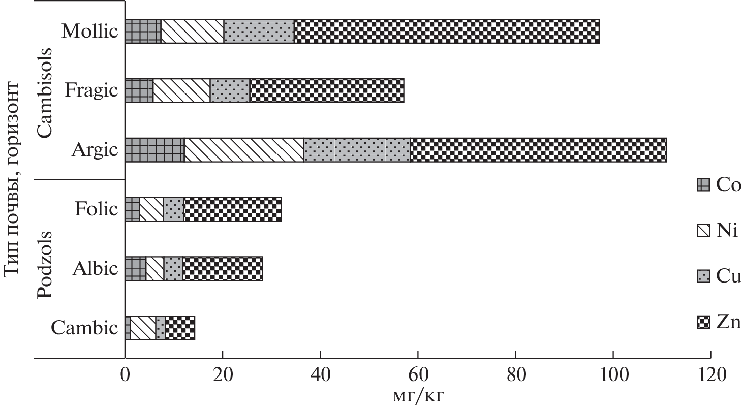 The article considers the distribution of mobile forms and bulk concentrations of Zn, Cu, Ni, Co in the genetic horizons of the studied soils at the studied area in the central part of the Valday Upland. The contents of easily soluble, exchangeable, and sum of potentially mobile forms of elements were determined by extraction method. It was found that in all genetic soil horizons, the bulk Zn content and the concentration of its mobile forms are higher than those of other elements, but Cu demonstrates the most intense migration. The predominant form of Cu migration is complexes with organic compounds. According to the calculated data of the extraction criterion (EC), the studied soils are background. The availability of Zn, Cu, and Co in the soils was estimated, which characterizes the potential reserves of elements as plant nutrients.