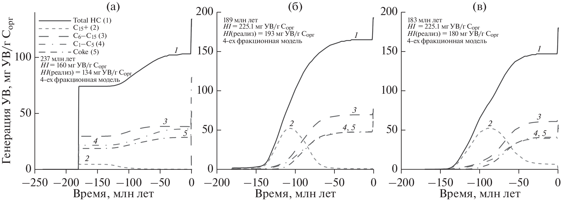 A model of the thermal evolution of the lithosphere of the West Siberian Basin in the area of Superdeep Well SG-6, which was drilled through the Koltogor–Urengoi graben, is used to numerically estimate the generation of various hydrocarbon (HC) fractions by the Triassic and Jurassic source rocks. The thermal model assumes the emplacement of a sill into the subsurface layers of the basement in the Early Jurassic and hydrothermal activity in the Late Pliocene–Lower Pleistocene, which noticeably impacted the conversion history of the HC potential of the Triassic and Jurassic source rocks. For the Triassic Pur formation, the emplacement of the sill into the subsurface layers of the basement in the Lower Jurassic drastically intensified the conversion of the HC potential to 84% and the degradation of more than 97% of the generated light oil mass. Calculations show that the heavy oil generated by the rocks of the Pur, Togur, and lower horizons of the Tyumen formations has degraded almost completely as a result of secondary cracking, while heavy oil predominates among the generated HC fractions in the upper horizons of the Tyumen Formation and in the rocks of the Bazhenovo Formation. The light oil remaining nowadays in the matrix of the source rocks has completely degraded in the Triassic rocks but makes up much of the HC products in rocks at the bottom of the Togur Formation and the top of the Tyumen Formation. This oil is the dominant in the upper horizons of the Togur Formation and in the bottom part of the Tyumen Formation. According to calculations, gas hydrocarbons account for a significant proportion of HC products in the Togur and Tyumen formations, and they dominate in the Middle Triassic Pur Formation. At the relatively low initial potential of HC generation and a low content of organic matter in the rocks of the Pur, Togur, and Tyumen formations, no primary expulsion threshold of liquid HC has been reached, and the generated liquid HC probably did not leave the rock matrix, while the gaseous HC likely migrated. The threshold of primary expulsion of liquid HC for the Bazhenov rocks was calculated to be reached at about 65 My.
