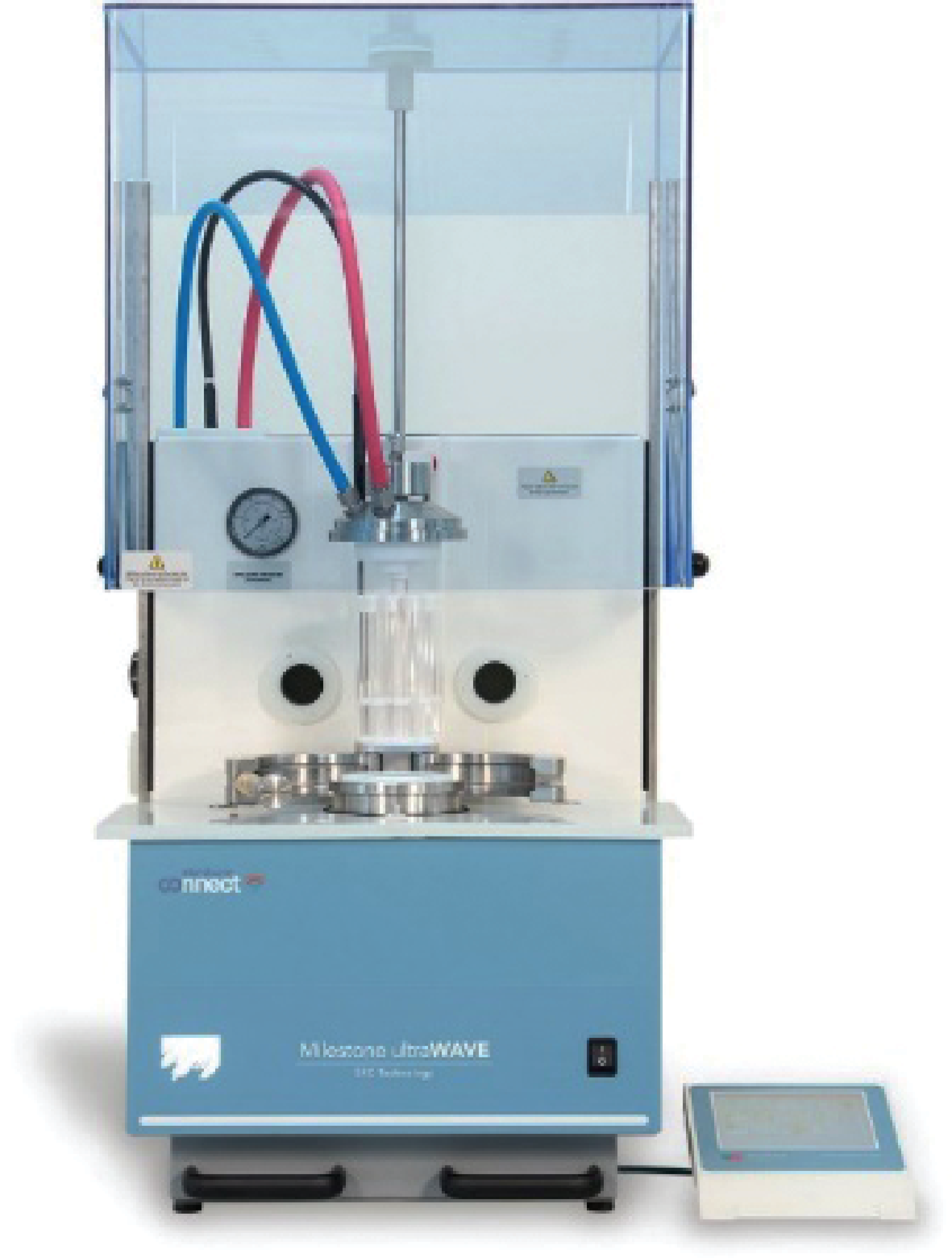 We report the first results of the application of UltraWAVE reactor-type microwave system for geological sample preparation (T = 250°C and P up to 80 bar) with a mixture of concentrated nitric and hydrochloric acids (3 : 1). Determination of the platinum group elements – Ru, Pd, Ir, Pt (PGE) and Re after acid digestion was carried out by isotope dilution using the high-resolution mass-spectrometer ELEMENT after chromatographic separation of analytes on an AG50Wx8 cation exchange resin. The monoisotopic rhodium was determined with 195Pt as an internal standard. The achieved detection limits were from 0.003 ng/g (Ir) to 0.09 ng/g (Pt). The correctness of the new procedure was confirmed by the analysis of geological reference samples—GP-13, UB-N, BHVO-2. The proposed procedure significantly accelerates and simplifies the preparation of geological samples for PGE and Re determination compared to the Carius tube technique.
