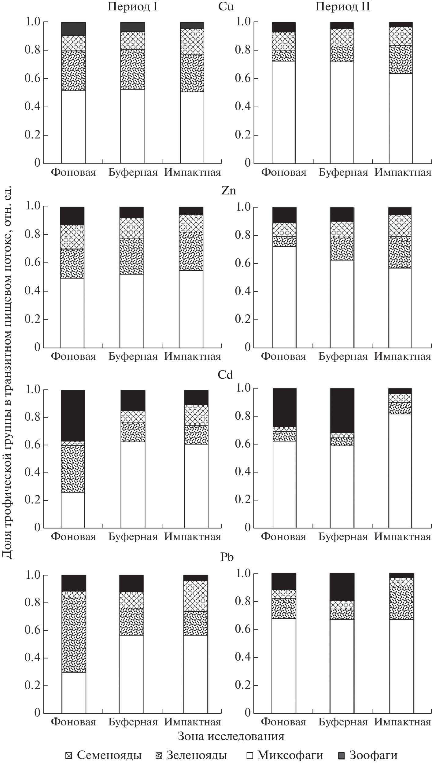 The participation of small mammals (SM) in the migration of essential (Cu, Zn) and toxic (Cd, Pb) trace elements (TEs) in forest ecosystems under conditions of severe industrial pollution of the environment (1990–2000) by a large copper smelter (Middle Urals, Russia) and after a significant reduction in its emissions (2010–2019) was considered. The peculiarity of transit food flows (TFF) in the pollution gradient was determined by the composition and abundance of animals of different trophic groups (phytophages, mixophages, zoophages), as well as the specifics of their diet. The reduction in emissions was accompanied by positive changes in the SM communities, expressed in an increase in the number and structural rearrangements of trophic groups (TG), which led to partial changes in the composition and amount of food consumed, as well as the content of TEs in them. By the end of the observation period in the background zone, the animal-controlled TFF remained stable for most TEs (Cu, Zn, Cd), for Pb it decreased by a factor of 2, but not as a result of reduced emissions. In contaminated areas, the value of TFF Zn has not changed, Cd has increased, Cu and Pb - decreased. It was concluded that in the taiga zone the main contribution to the dynamics of biogenic TEs flows over time and space was made by a group of mixophages that dominated the pollution gradient.