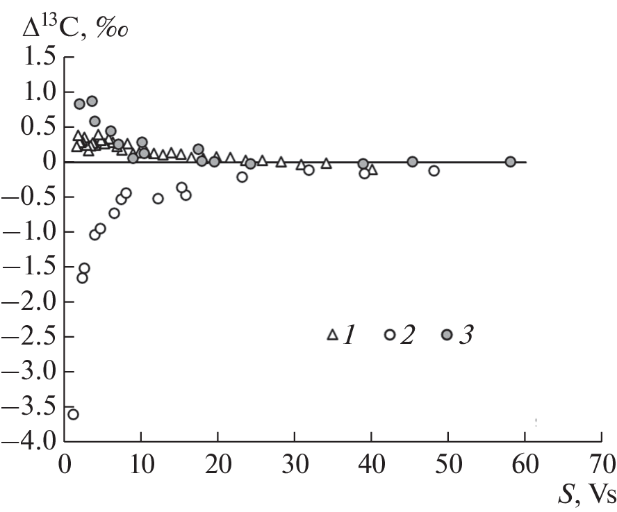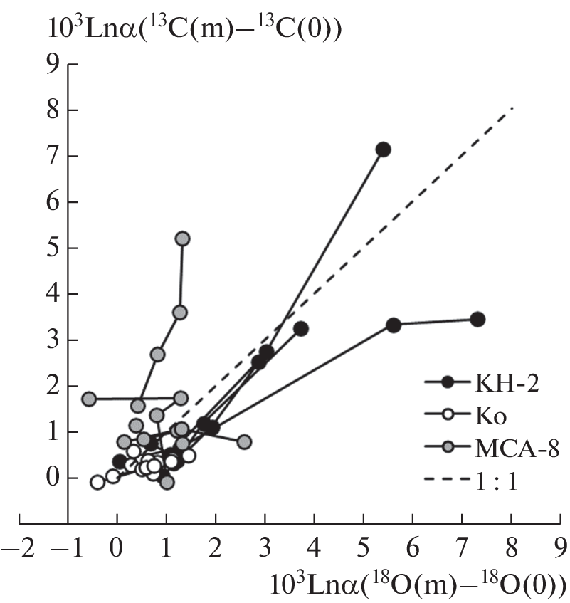 Проведено экспериментальное изучение основных факторов, влияющих на точность изотопного анализа кислорода и углерода карбонатов, диспергированных в силикатном матриксе. Искусственные 1, 2, 5 и 10%-ные смеси кварца с разными по изотопным параметрам карбонатами (КН-2, Ко, МСА-8) анализировались методом изотопной масс-спектрометрии в постоянном потоке гелия (CF IRMS). Установлено, что помимо влияния приборной нелинейности анализа малых количеств газа образца, на результаты влияют два фактора – следовые количества СО2, постоянно присутствующие в системе (эффект бланка) и присутствие химически нейтральных частиц силиката (эффект матрикса). Эффект бланка зависит от изотопных параметров образца и практически не влияет на оценку содержания карбоната в породе. Эффект матрикса, напротив, сильно сказывается на оценке содержания карбоната в породе, а изотопный сдвиг, им вызываемый, всегда направлен в сторону обеднения образца тяжелыми изотопами 13С и 18О. Показано, что данный эффект связан с процессами, протекающими в зоне интерфейса “СО2–кислота–поверхность кварца”, которые сопровождаются кинетическим фракционированием изотопов углерода и кислорода. Оба эффекта зависят от количества силикатного матрикса в системе и должны проявляться при анализе пород, бедных карбонатами. При содержании карбонатов в породе около 1–2%, отклонения от истинных значений δ13С и δ18О могут достигать первых промилле, а оценки содержаний карбоната в породе, проведенные методом калибровки хроматографического пика, могут быть занижены на 20–40%.