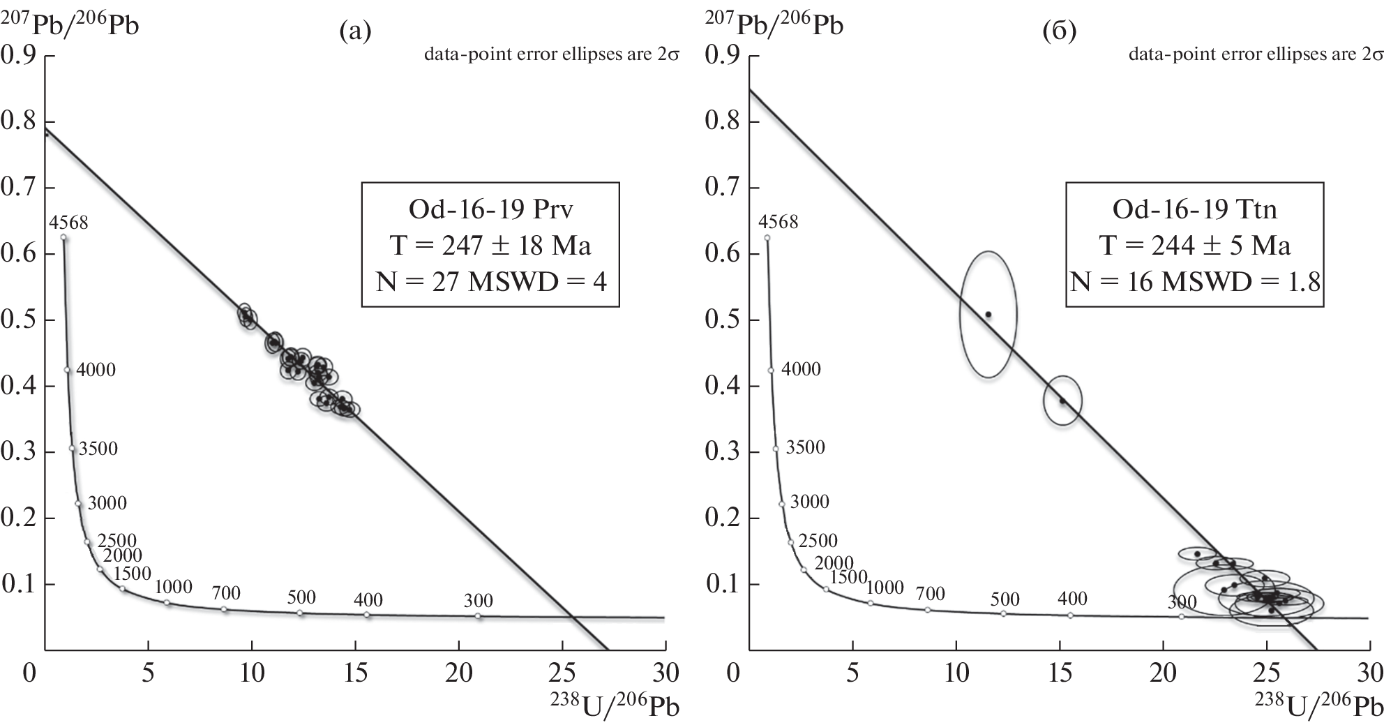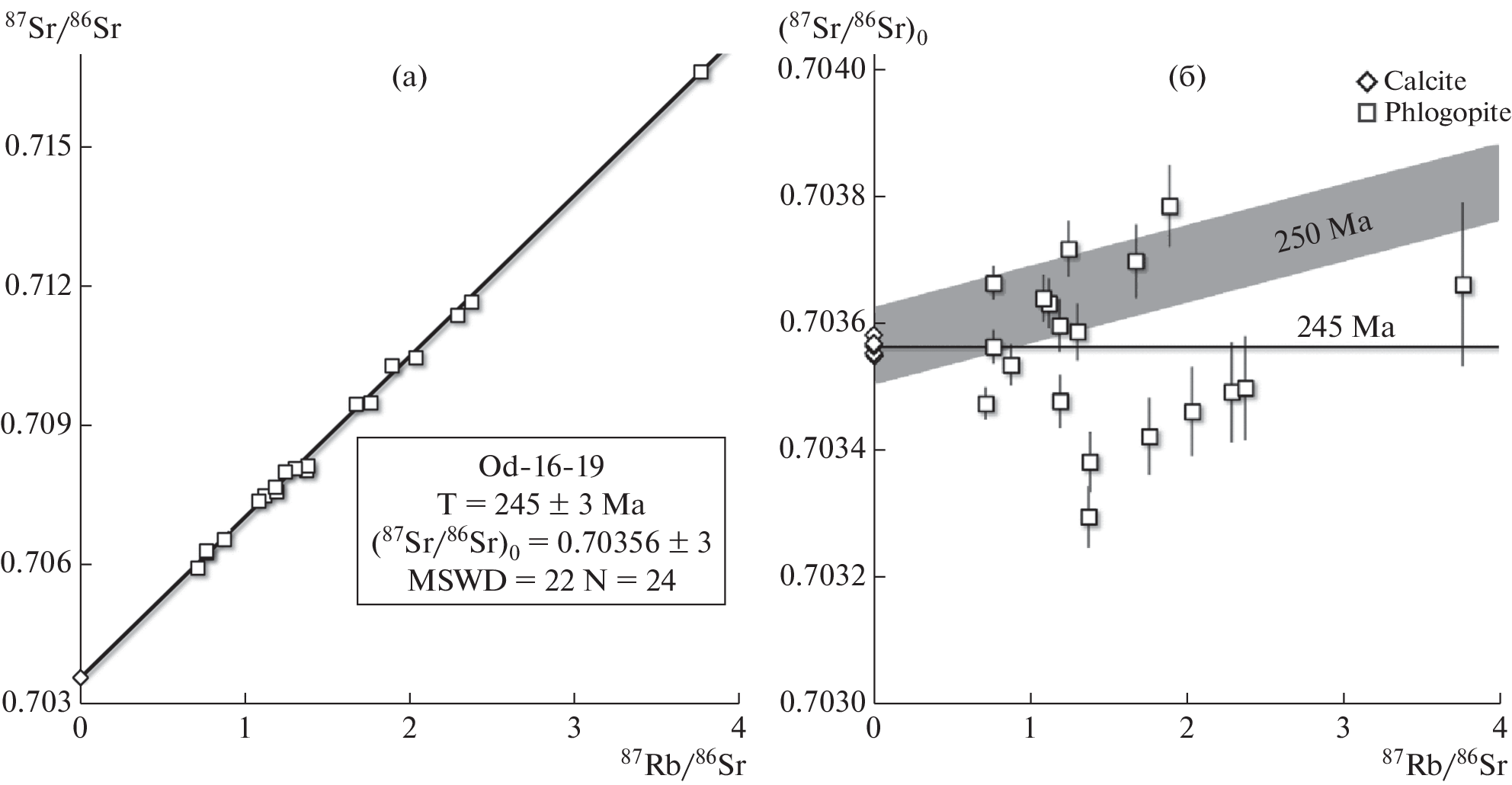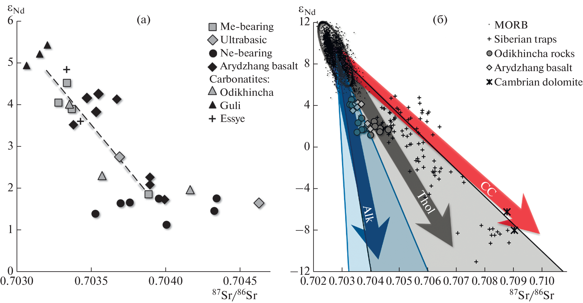 This study focuses on the igneous rocks composing the Odikhincha massif. The massif is typical ring alkaline–ultrabasic massif with carbonatites, second largest in the Maimecha-Kotui province. The Sr-Nd isotopic values of the traps of the Arydzhang Formation and the host dolomites were also determined for comparison. The Rb–Sr isotope system of phlogopite and calcite from the Od-16-19 carbonatite of the Odikhincha massif is disturbed; the obtained age on the mineral isochrone (245 ± 3 Ma) is close to the time of formation of the Siberian traps and rocks of the ultrabasic–alkaline Maimecha-Kotui complex, but the large scatter of analytical points (MSWD = 22) does not allow this date to be considered as reliable. The disturbance of the isotope system is probably related to the fact that the strontium isotope ratio in the fluid was not constant during autometasomatic phlogopitization of carbonatite. The U–Pb isotopic system of titanite and perovskite from the same carbonatite sample Od-16-19 also appeared to be disturbed, since data points formed discordia. The U–Pb age obtained for titanite and perovskite are 244 ± 5 Ma (MSWD = 1.8) and 247 ± 18 Ma (MSWD = 4), respectively. Apparently, the age values provided by the two isotopic systems (245 ± 3 Ma by Rb–Sr and 247 ± 18 and 244 ± 5 Ma by U–Pb) are consistent with each other and reflect the time of metasomatic processes, i.e., phlogopitization and iolitization. Rb–Sr and Sm–Nd isotope data for ultrabasic–alkaline intrusive rocks with carbonatites of the Odikhincha massif and volcanics of the Arydzhang Formation indicate an enriched, relative to the composition of the convecting mantle, isotopically heterogeneous source of their parent melts. This source could be a combination of ultrabasic mantle rocks and rocks of basic composition (basites). The latter played the role of an enriched component. No signs of contamination of the melts with the host sedimentary rocks in situ were found, however, variations of Sr and Nd isotopic ratios in the rocks of the Odikhincha massif may indicate that during the introduction of deep magmas their interaction and substance exchange with the surrounding rocks of the lithosphere continued up to complete solidification of the melts, as indicated by the nature of local isotopic heterogeneity within the Odikhincha intrusion.
