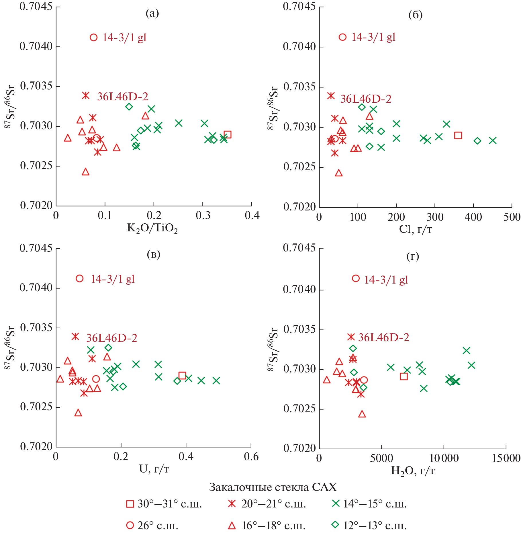 This paper presents the new geochemical isotope (Sr–Nd system, H2O, Cl) data obtained for basalt glasses of the Mid-Atlantic Ridge (MAR) sampled from six areas of the MAR axial zone between 31° and 12° N. The data are consistent with the existing ideas about large-scale geochemical segmentation of the MAR. It is shown that samples from predominantly serpentinite segments have a narrower range of variations of strontium isotopic composition (87Sr/86Sr = 0.7027–0.7032) in comparison with samples collected from the areas where the crustal section is dominated by basalts (87Sr/86Sr = 0.7024–0.7041). The variation ranges of the neodymium isotopic composition in these two groups of samples are almost identical (εNd = +4.9 to +10.9 and +5.9 to +11.6 in serpentinite and basalt segments, respectively), although, in general, serpentinite segments have a slightly more enriched composition. The wide variations of the neodymium isotopic composition and increased contents of Cl, H2O, and U, as well as increased K2O/TiO2 and La/Sm ratios, in samples from serpentinites can most probably be related to the participation of different geochemically heterogeneous sources in the magmatism of the MAR axial zone. The influence of enriched plume-type matter cannot be excluded in some segments. The isotopic composition of noble gases may shed light on the subject.
