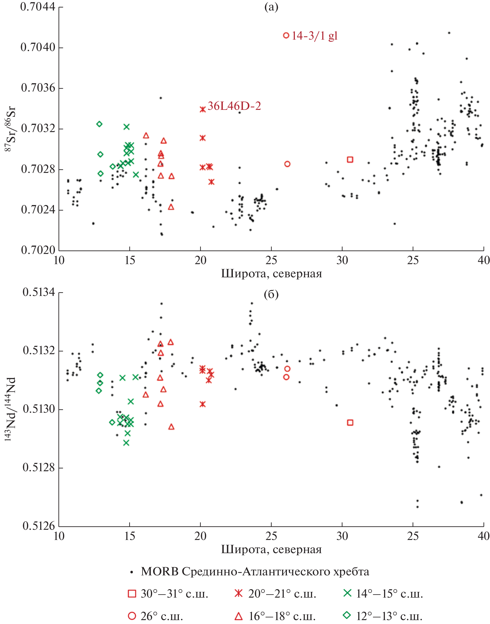 - Силантьев С.А., Данюшевский Л.В., Плечова А.А., Доссо Л., Базылев Б.А., Бельтенев В.Е. (2008) Геохимические и изотопные черты продуктов магматизма рифтовой долины САХ в районах 12°49′–17°23 с.ш. и 29°59′–33°41 с.ш.: свидетельство двух контрастных источников родительских расплавов. Петрология. 16(1), 38-65.