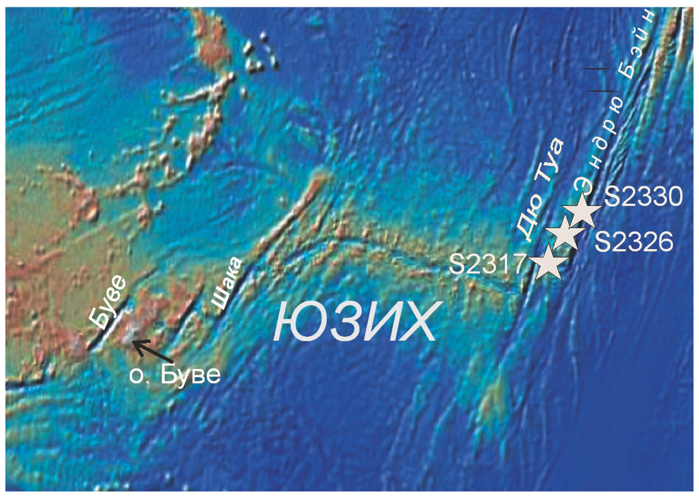 Рис. 1. Расположение станций драгирования (звездочки) 23 рейса НИС “Академик Николай Страхов” в пределах Юго-Западного Индийского хребта, из которых были исследованы слабо измененные базальты и долериты.