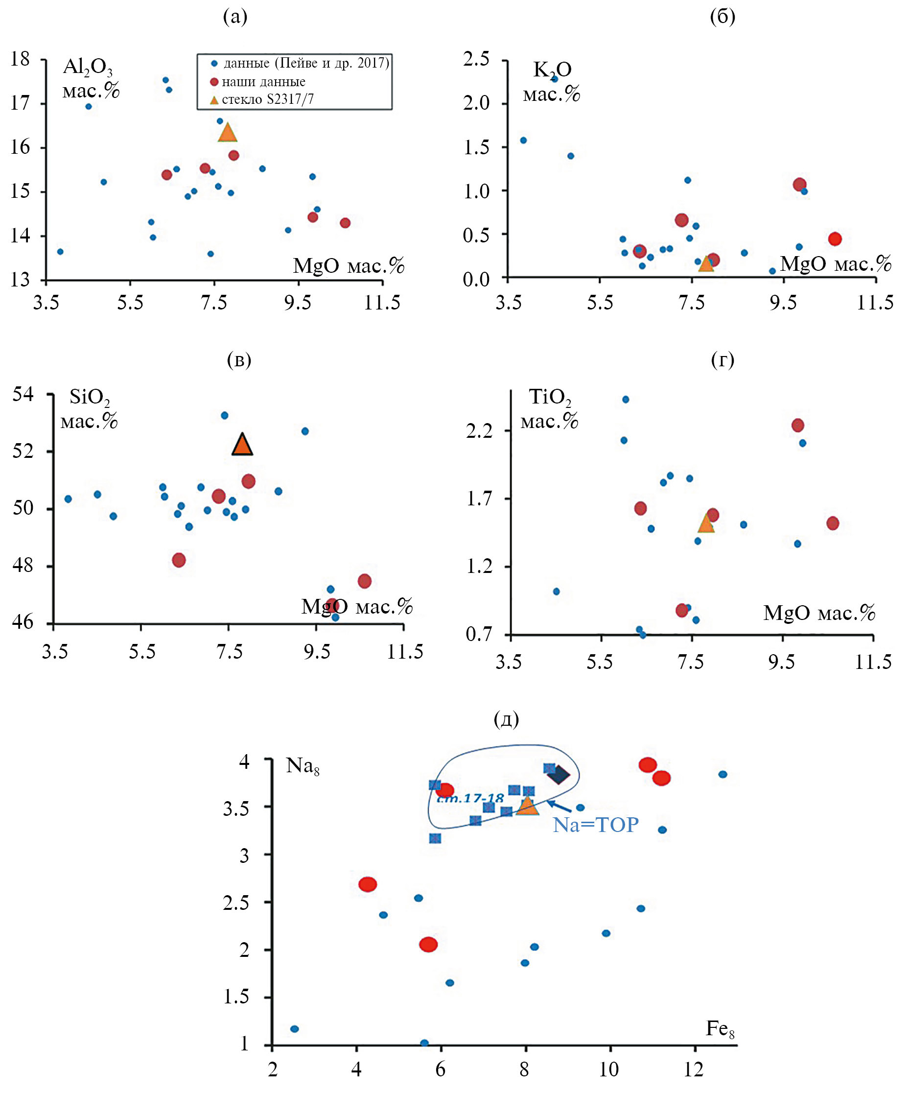 3. Fig. 2. The content of the main elements in basalts and dolerites of the Andrew Bain fault zone area. (a-d) – Correlation dependences of Al, K, Si, Ti on MdO; (e) – Na8-Fe8 parameters showing the differences of these elements in the initial melts, depending on the depth and degree of melting of the oceanic mantle (Klein, Langmuir, 1987, 1989). The compositions of basalts of others S2317, 18 (squares) clearly related to the small- scale type of Na-TOR tholeites are highlighted by the field (Sushchevskaya et al., 2002). The rhombus marks the composition of the primary Na-TOR melt according to (Sushchevskaya et al., 2002). The data from the table are used. 1 and works (Peivet et al., 2017).