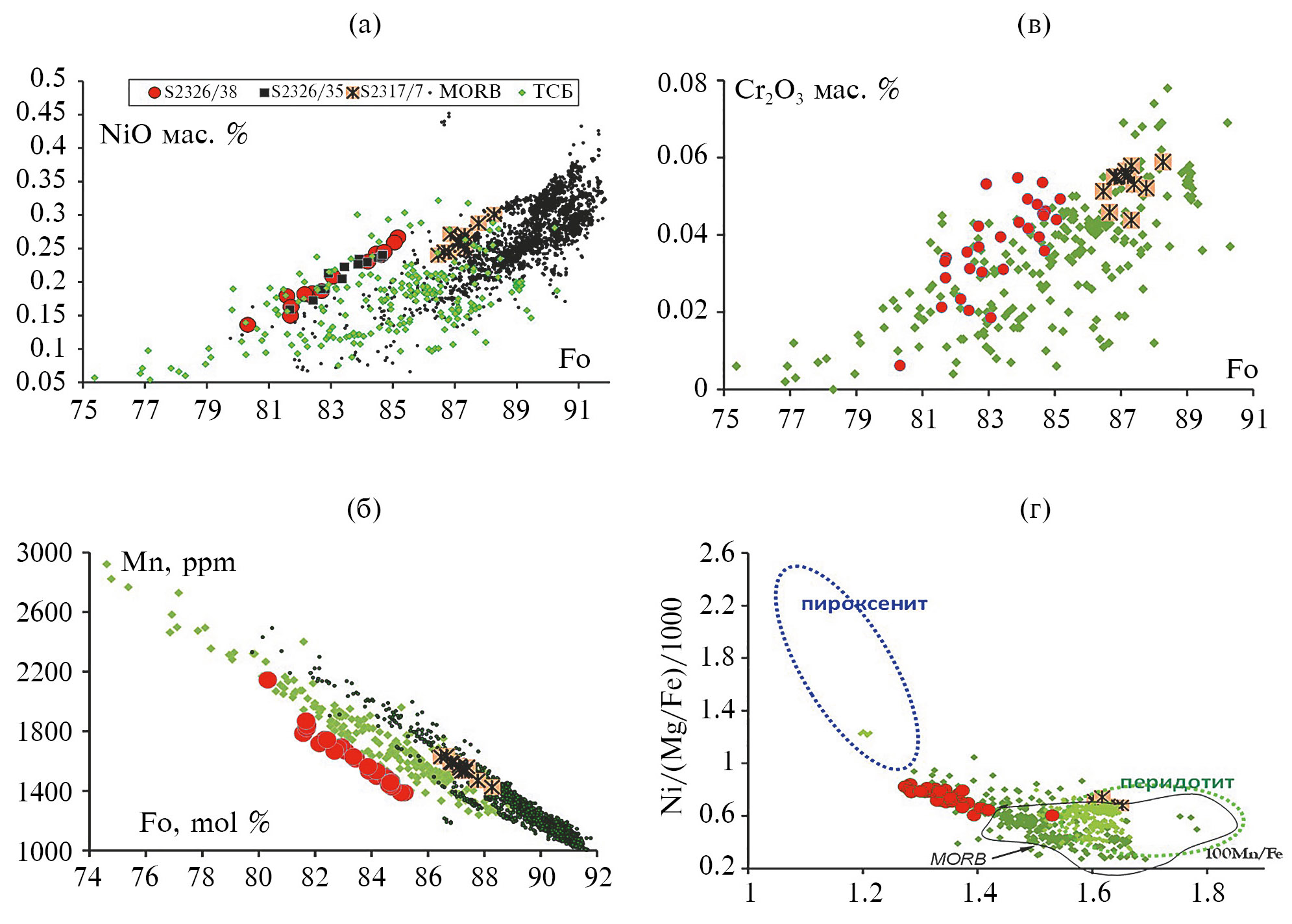 4. Fig. 3. Changes in the content of Ni, Cr and Mn in olivine inclusions of the Andrew Bain fault zone. Correlations of concentrations of Ni, Cr, and Mn and the magnesia of olivine (Fo) in various oceanic provinces (a, b, c). (d) - Change in values of 100×Mn/Fe Ni/(Mg/Fe)/1000, showing compositions of olivines in equilibrium with peridotite and pyroxenite the mantle (Sobolev et al., 2007).