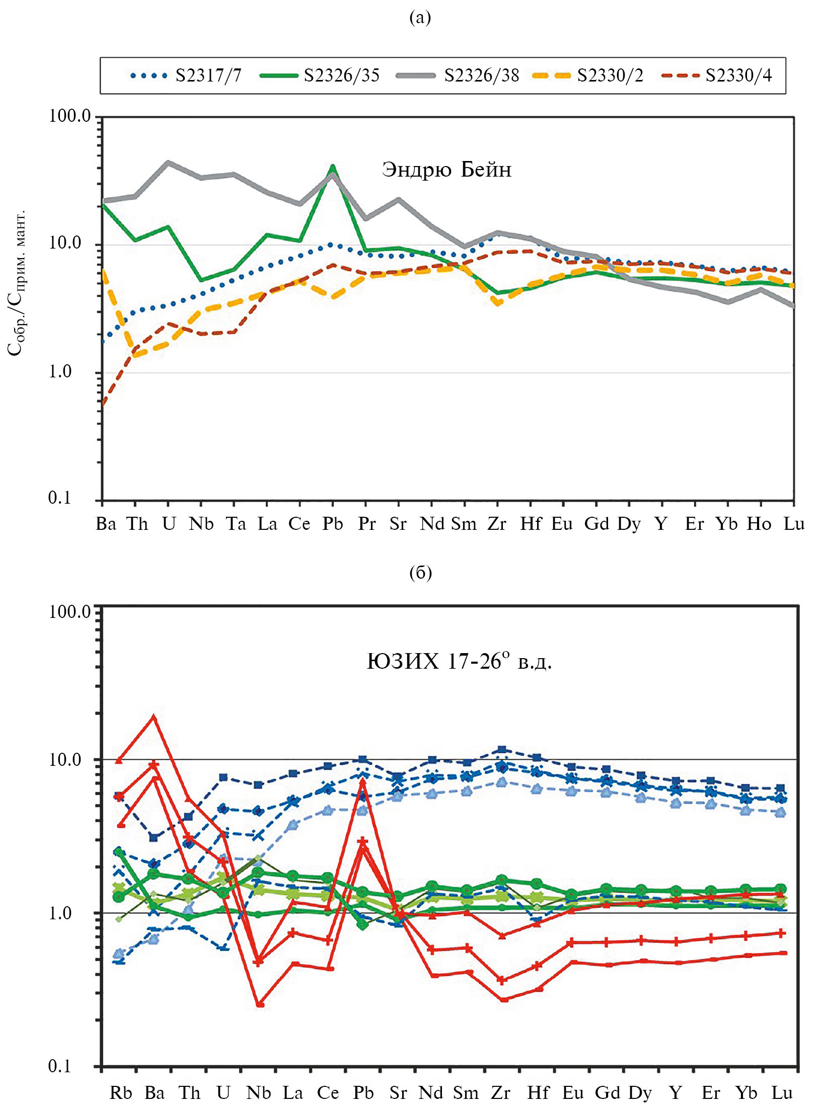6. Fig. 5. The nature of variations of the lithophilic element contents normalized to the primitive mantle (Sun, McDonough, 1989) in the basalts of the Andrew Bayne area (a) and the adjacent YUZIH area (b). Constructed according to Table. 1 and works (Janney et al., 2005).