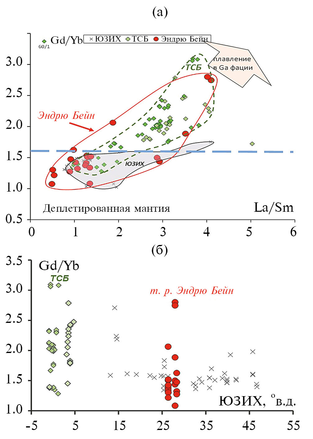 7. Fig. 6. Variations of the Gd/Yb ratio in the toleites of the zone Andrew Bain (a) and YUZIH from the TSB area to 50° VD (b). Data from Table were used. 1 and works (Janney et al., 2005; Migdisova et al., 2017).