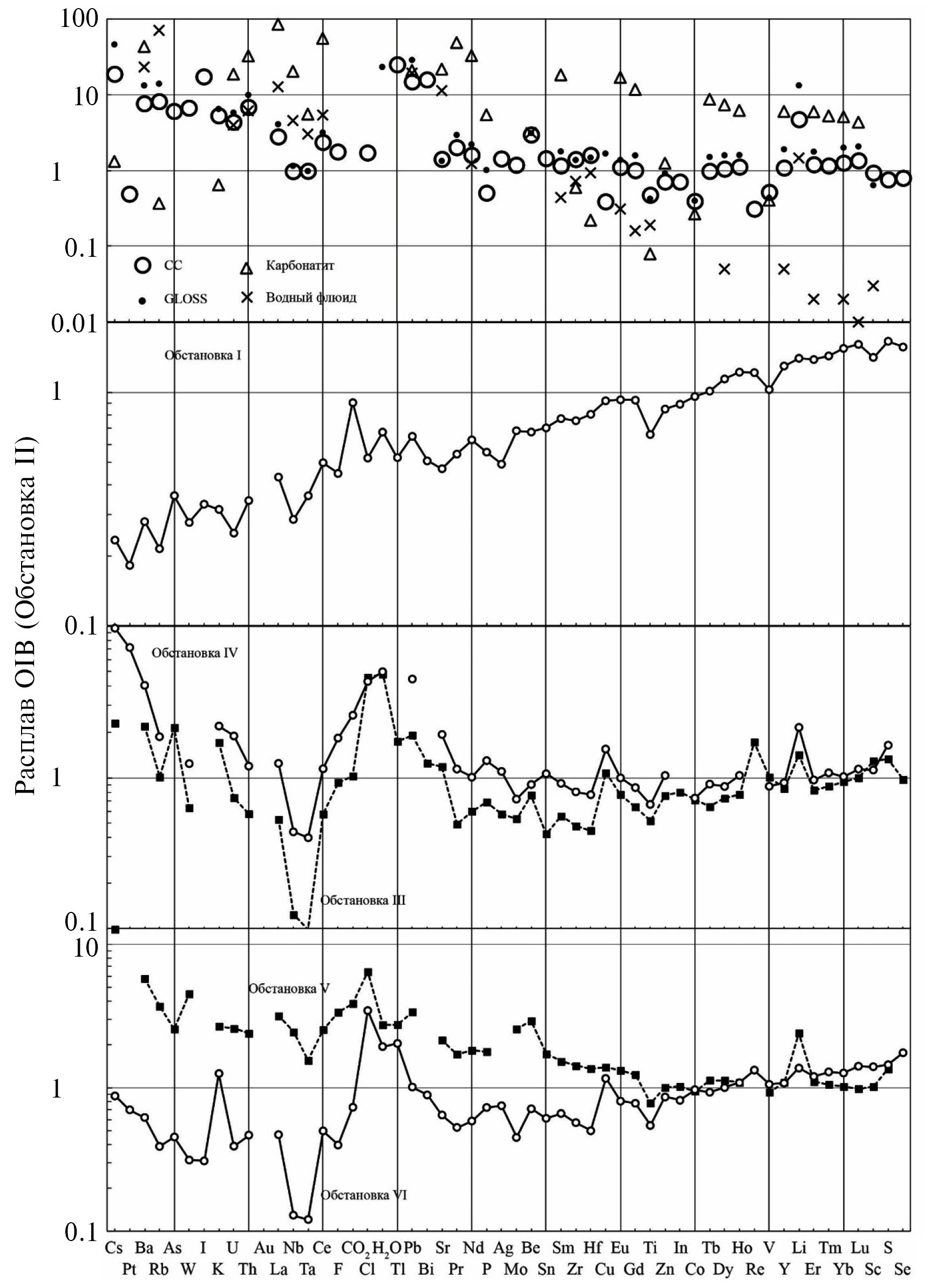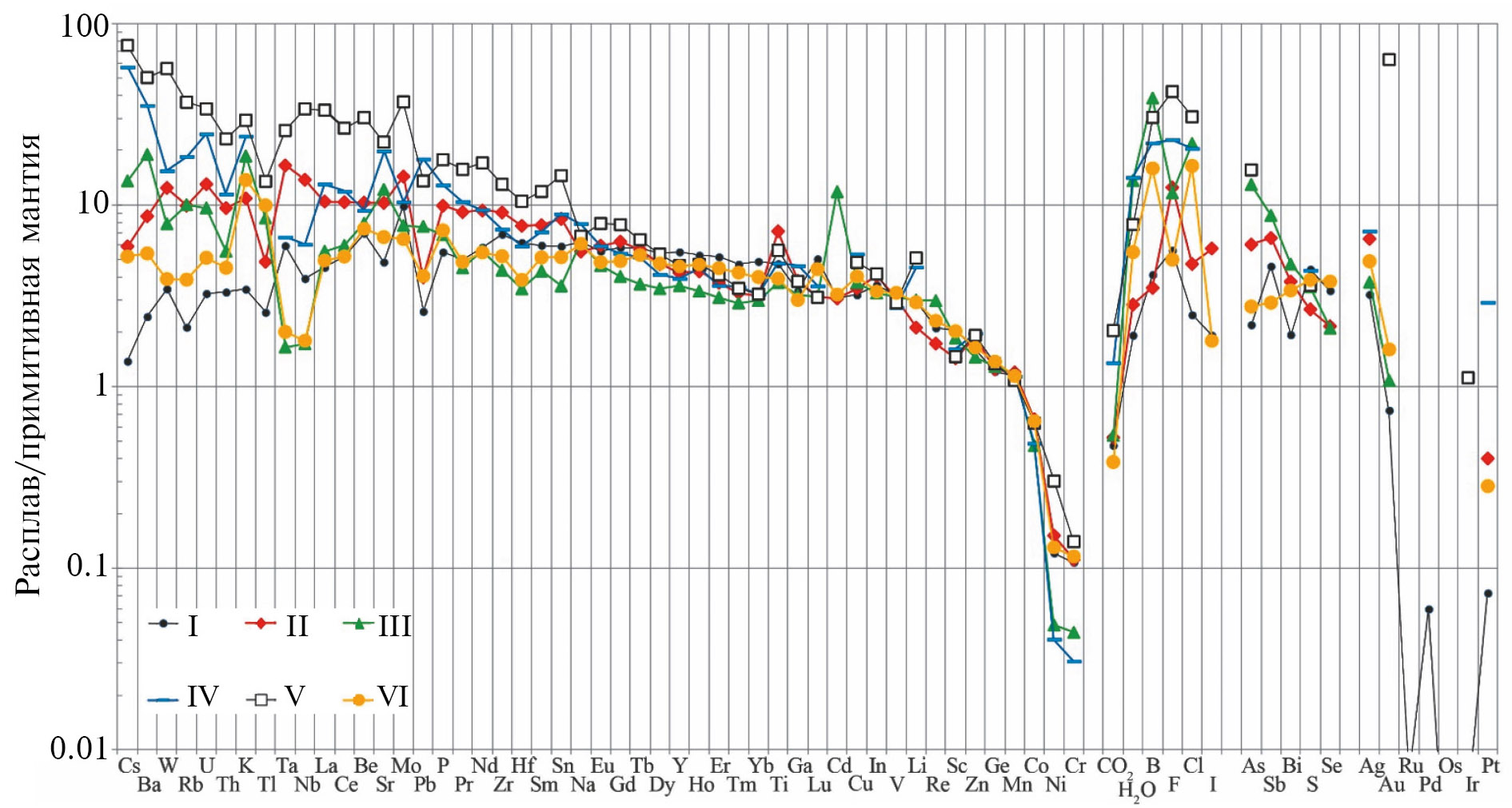 Таблица 1. Средние содержания элементов в псевдопервичных основных расплавах разных геодинамических обстановок, рассчитанные с учетом удаления оливина и плагиоклаза при кристаллизации первичных магм – I II III IV V VI