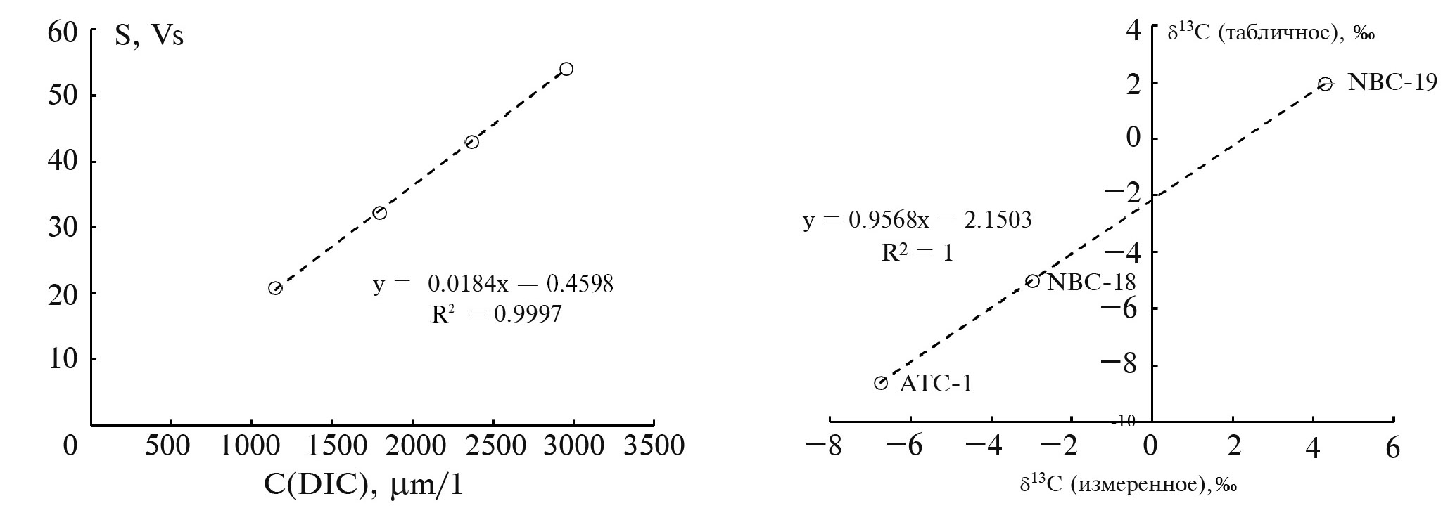 Рис. 1. Калибровочные линии для определения концентрации и изотопного состава DIC: (а) зависимость площади опорного пика S (Vs – вольт*секунд) от концентрации калибровочного раствора NaHCO3; (б) трехточечная калибровка величин δ13С по карбонатным стандартам. Параметры калибровочных уравнений используются для расчета концентрации DIC и величин δ13С(DIC) в образцах, проанализированных в той же измерительной серии.