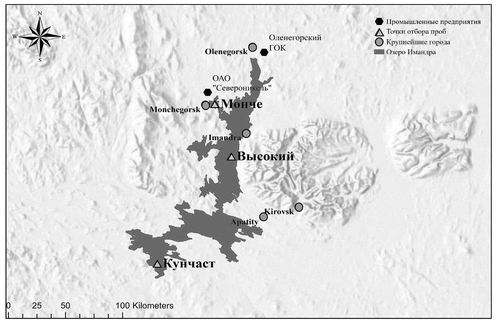 Водосборная территория озера отличается большим количеством месторождений природных ископаемых, что привело к развитию крупного промышленного комплекса и значительному техногенному воздействию на водоем, которое началось в 1930–1940-е гг. и достигло максимума в 1980-е гг. На восточной части оз. Имандра было открыто уникальное месторождение апатит-нефелиновых руд, по реке Белой с рудника сточные воды стали попадать непосредственно в озеро, достигая максимума в 70-е гг. XX в. и с последующим снижением в результате введения оборотного водоснабжения и сокращением производства. В северной части озера – Большой Имандры, в 1938 г. был открыт комбинат “Североникель”, сточные воды которого стали поступать в залив Монче. Максимум воздействия комбината пришелся также на 1970–1980 гг. В составе поступающих в озеро сточных вод отмечаются высокие концентрации меди, никеля, нефтепродуктов и других загрязняющих веществ. На самый северный залив озера Куреньга главным образом влиял горно-обогатительный комбинат Оленегорский ГОК (Моисеенко и др., 2002) (рис. 1).