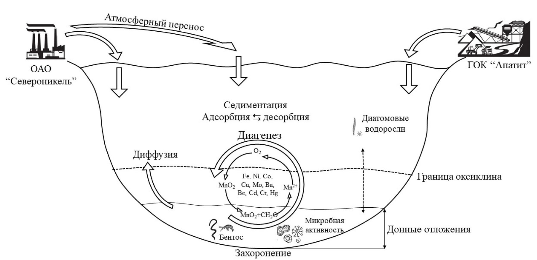 В работе Даувальтера В. А. (2020) показано формирование в поверхностных слоях донных отложений водоемов высоких концентраций ТМ (Ni, Сu, Co, Cd, Pb, As, Hg, Fe, Mn), превышающих фоновые содержания в десятки раз, которые преимущественно были связаны с органическими лигандами. Феномен редокс-цикла широко известен, он возникает в природных горизонтах озер, обогащенных органическим веществом и при отсутствии кислорода, включая озеро Имандра (Hongve, 1997; Moiseenko et al., 1997; Newsome et al., 2020). Было показано, что наряду с Mn и Fe в этот процесс вовлекается большая группа микроэлементов, включая Ni, Cu, Co, Cd, Pb, As, Hg.