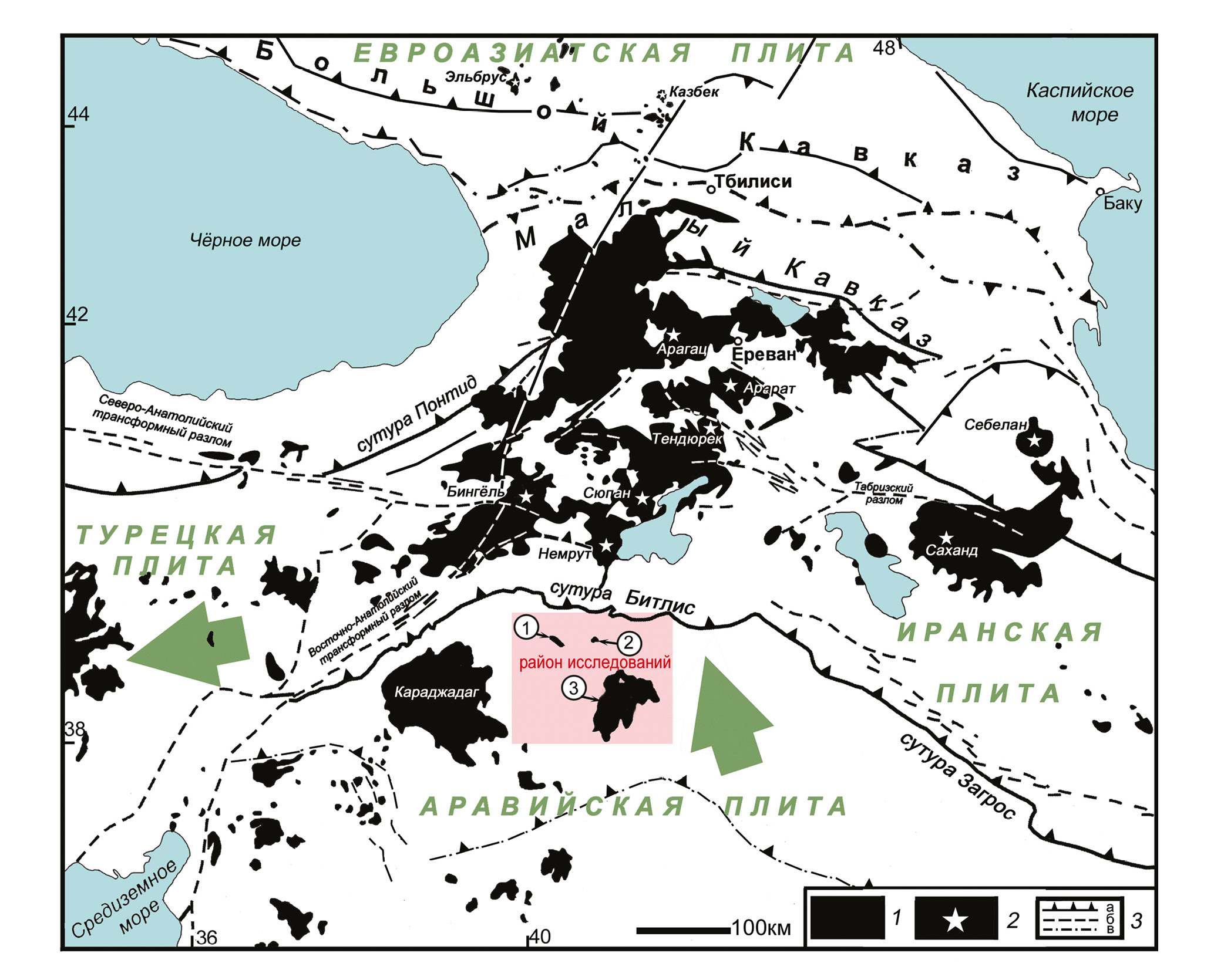 Евразийско-Аравийская коллизионная зона охватывает всю северную часть Аравийской плиты, Восточно-Анатолийское нагорье, сложенное породами надсубдукционного и аккреционного комплексов, и складчатые сооружения Большого и Малого Кавказа. Позднекайнозойский вулканизм начался здесь в начале-середине миоцена в зоне Восточно-Анатолийского трансформного разлома после завершения коллизии Евразийской, Турецкой, Иранской и Аравийской плит и окончательного закрытия океанического бассейна Неотетис (Okay et al., 2010; Karaoğlan et al., 2016; Oyan, 2018; Açlan, Altun, 2018). Впоследствии магматическая активность мигрировала к северу на территорию Восточной Анатолии и в конце миоцена появилась уже в пределах Кавказского региона (Лебедев и др., 2013). Опубликованные данные (Ercan et al., 1990; Notsu et al., 1995; Lustrino et al., 2010; Keskin et al., 2012а, б; Ekici et al., 2012, 2014; Türkecan, 2015; Lebedev et al., 2016; Özdemir et al., 2019; Oyan et al., 2023) свидетельствуют о том, что проявления молодого базальтового вулканизма повышенной щелочности широко распространены в пределах всей коллизионной зоны. Однако к северу от сутурной зоны Битлис-Загрос в источниках расплавов отчетливо заметно присутствие субдукционной компоненты, появившейся в мантийных резервуарах под регионом в период закрытия океана Неотетис, в то время как к югу от этой зоны в пределах крайней северной части Аравийской плиты (плато Газиантеп, Шанлыурфа, Караджадаг, Алемдаг и др.) вулканическая активность представлена извержениями щелочных базальтов с внутриплитными геохимическими характеристиками.