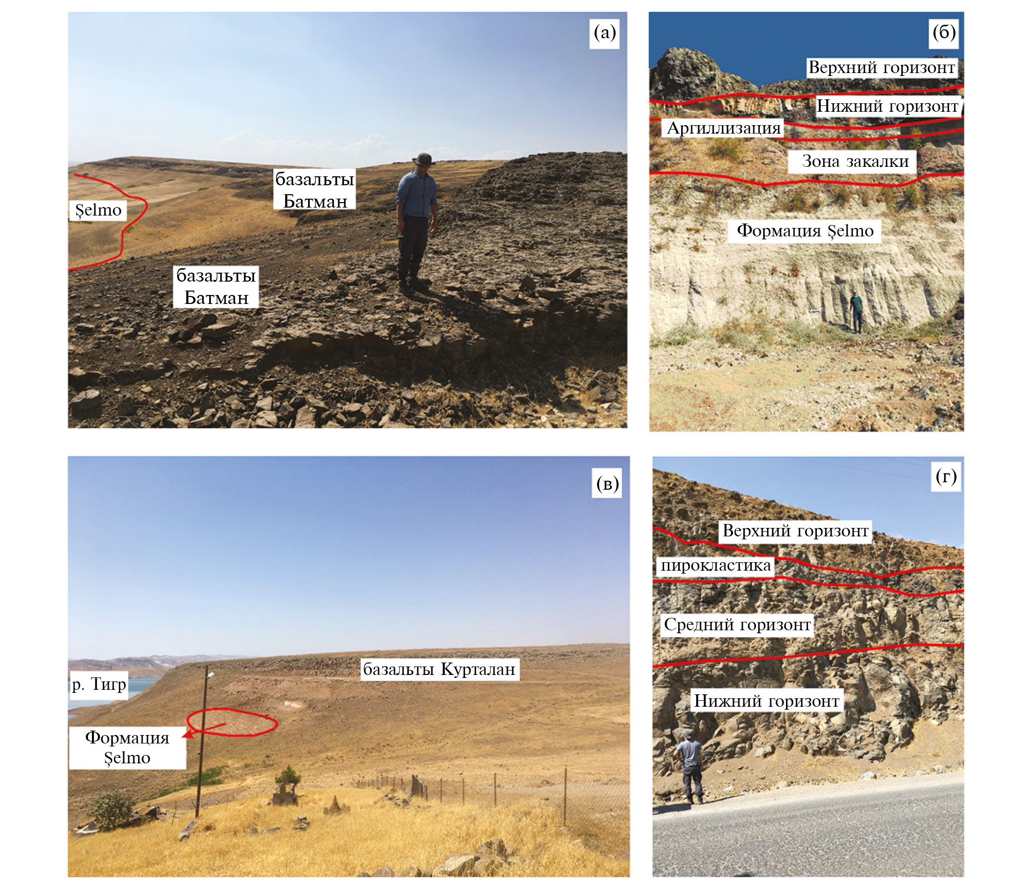 Рис. 3. Стратиграфические взаимоотношения молодых базальтовых лав и осадочных образований чехла Аравийской плиты в пределах изученных ареалов молодого вулканизма (фото – V. Oyan). (а) – вулканический покров Батман в районе горы Кира; (б) – залегание базальтов покрова Батман на осадочных образованиях формации Şelmo с образованием мощной зоны закалки; (в) – базальтовые лавы вулканического центра Курталан в долине р. Тигр; (г) – три стратиграфических уровня лав плато Алемдаг.