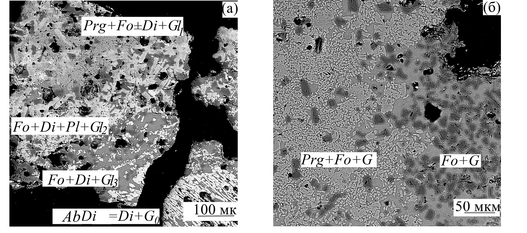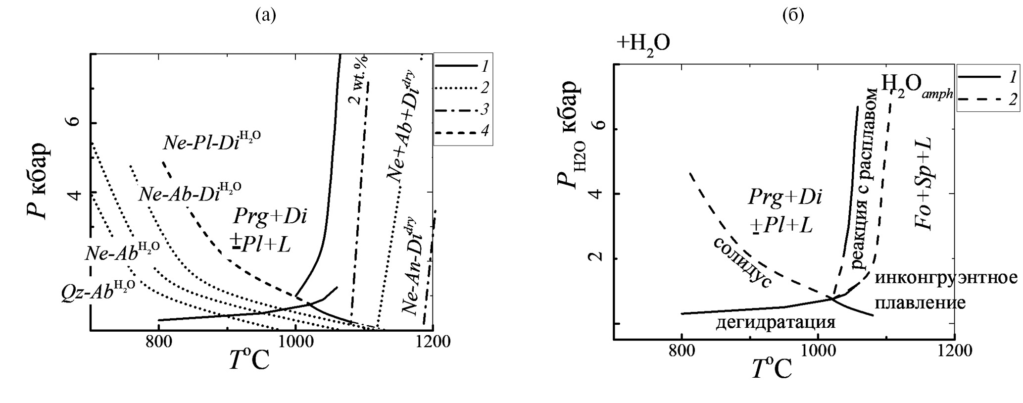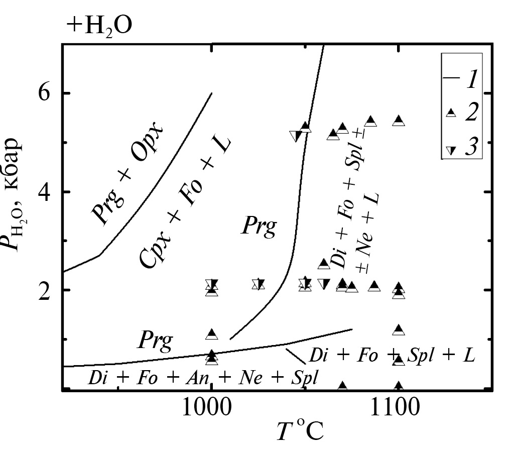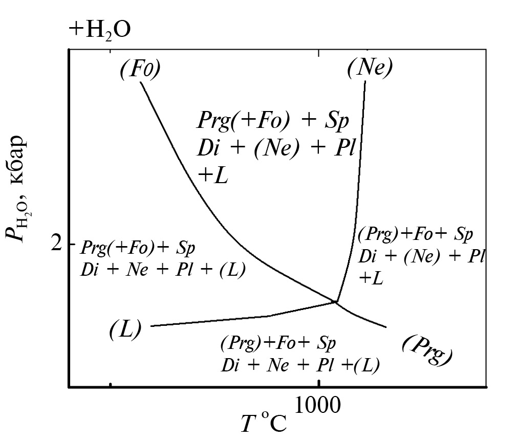 Бесфорстеритовая (Fo) отвечает возможному появлению Ne–Pl–Di водонасыщенных расплавов. Линия экстраполирована из данных эвтектики для крайнего минала плагиоклаза – альбита и нанесена параллельно появлению Ne–Ab–Di расплавов, со смещением в высокотемпературную область (рис. 6, 7). Существование щелочного расплава в равновесии с паргаситом подтверждено экспериментально.