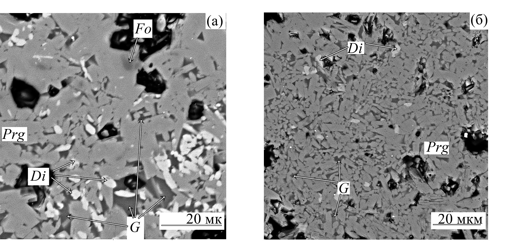 Равновесие достигнуто не во всех опытах. По нашим данным в опытах с подходом по температуре снизу при РH2O = 2 кбар равновесие достигалось за 24 часа. В опытах с подходом по температуре сверху близкие к равновесию парагенезисы появлялись за 20 мин. Для 5 кбар равновесие снизу при температурах опыта 1050–1100°C достигалось менее, чем за 4 часа.
