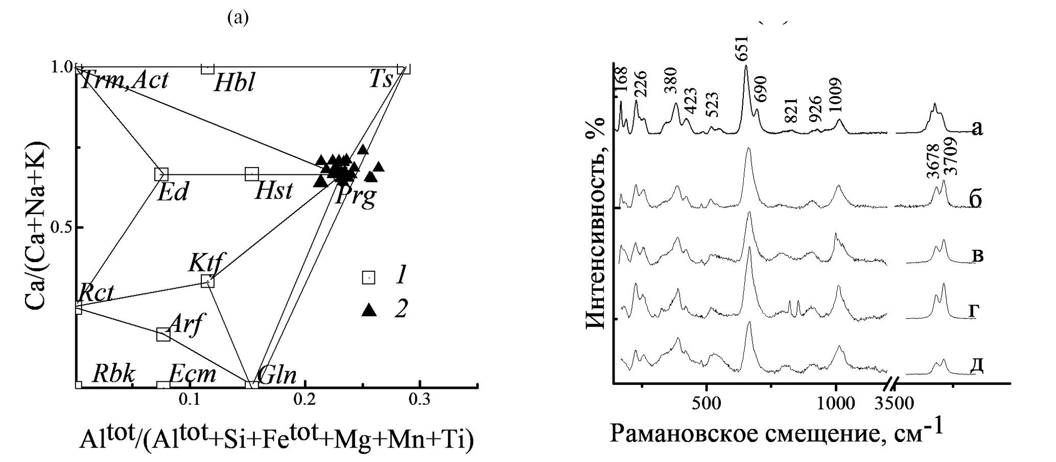 Паргасит исследован на сканирующем электронном микроскопе методом энергодисперсионной рентгеновской спектроскопии (SEM-EDS) По данным микрозондового анализа амфибол однороден и отвечает стехиометрии паргасита (табл. 1). На рентгенограмме посторонних пиков не выявлено.