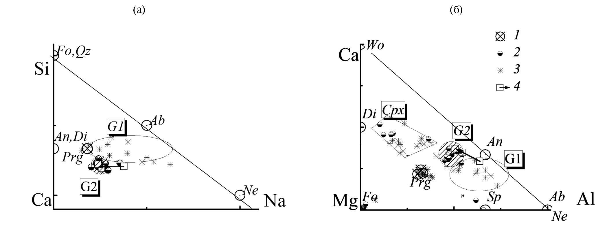 На рисунок 6а нанесена линия сухой эвтектики Ne–An–Di. Параметры плавления рассчитаны с помощью программы MELTs Rhyolite 1.0.2 (Ghiorso, Sack,1994). Линия наблюдаемого в работе плавления проведена по 1 точке при РH2O = 2 кбар и 1087 < T < 1100°С, субпараллельно сухому плавлению. Линия нанесена условно и нуждается в уточнении (рис. 6а, 6б).