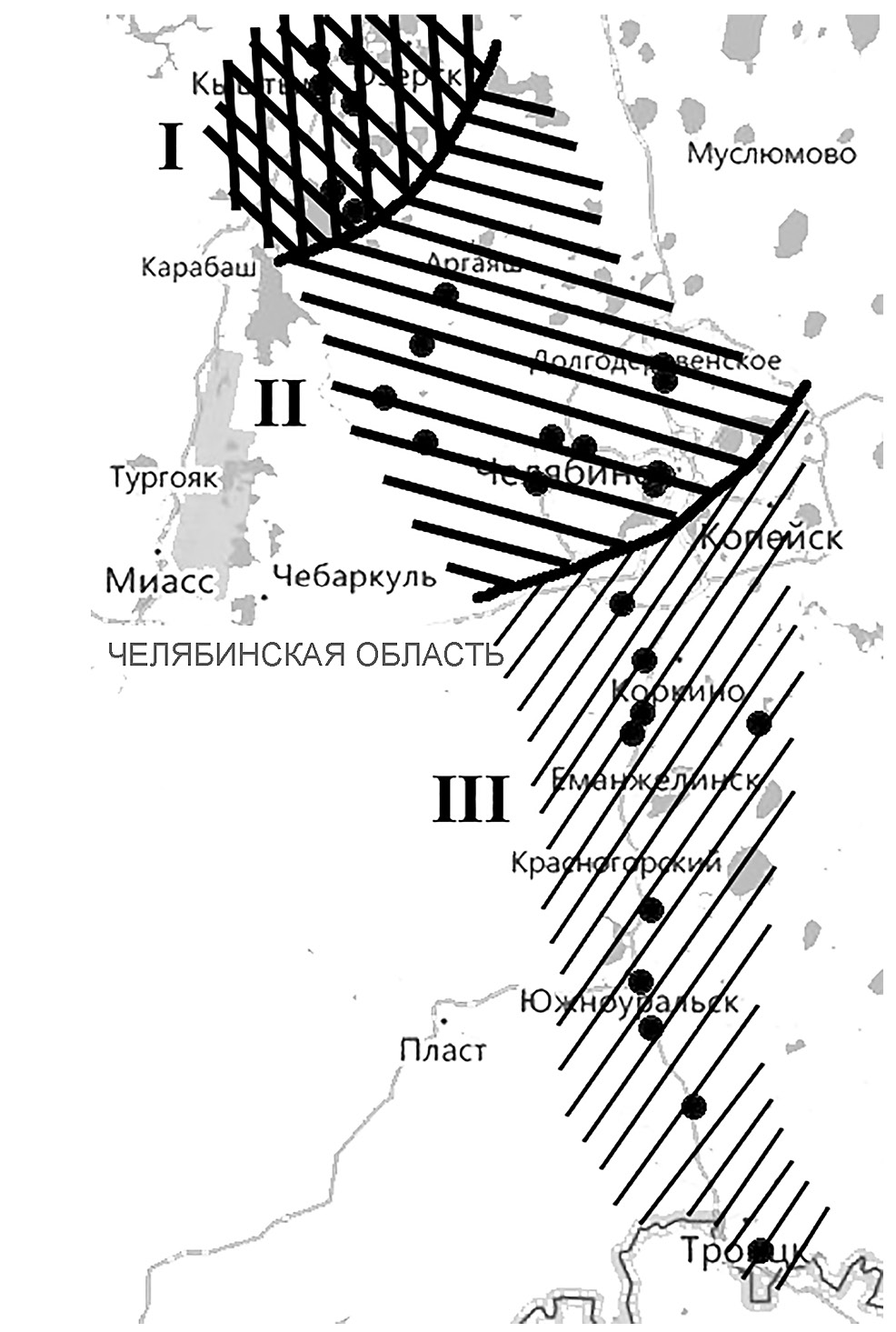 Рис. 2. Подразделение исследованной территории Челябинской области на зоны экологической напряженности по показателям суммарного загрязнения почв. I – опасная категория загрязнения (среднее значение Zc = 96.5), II – умеренно опасная категория (Zc = 23.5), III – категория с допустимым загрязнением почв (Zc = 3.7).