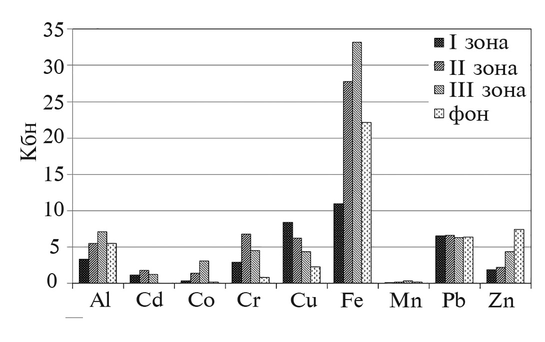 Средние значения Kк для почв в целом по исследованной территории демонстрируют повышенное относительно фона содержание Cr (в 12.6 раз), Zn (в 9.6 раз), Pb (в 8.3 раза), Cd (в 4.1 раз), что может быть результатом как наличия естественных геохимических аномалий, так и техногенного воздействия. Для Cu и Fe превышения фоновых значений составляют около 2 раз, для таких элементов, как Al, Co, Mn, Kк варьирует в пределах 1–2 раза.