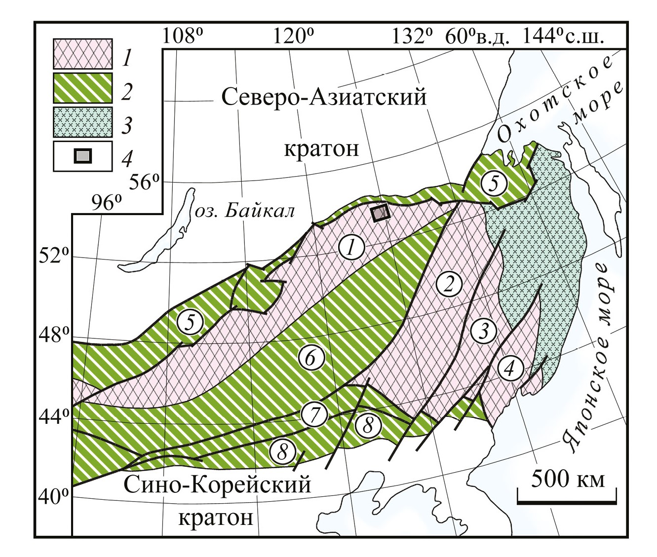 Цифры в кружках: 1 – Аргунский, 2–4 Бурея-Цзямуси-Ханкайский супертеррейн (2 – Буреинский, 3 – Цзямусинский, 4 – Ханкайский террейны), 5 – Монголо-охотский, 6 – Южномонгольский, 7 – Солонкерский, 8 – Вундурмиао складчатые пояса.