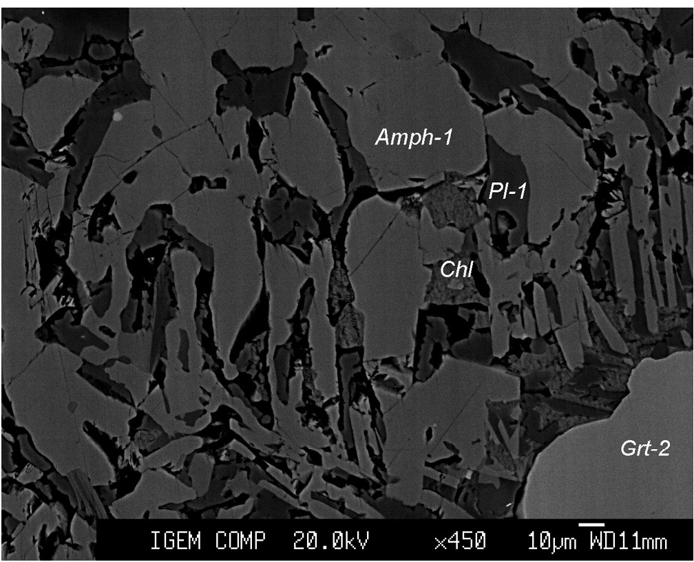 (1) Реликтовая ассоциация, вероятно, была представлена гранатом-1, омфацитом и кварцем, то есть представляла собой эклогиты. Но сохранилась она весьма плохо. От омфацита остались только характерные структуры распада, представленные плагиоклаз-клинопироксеновым симплектитом. При этом клинопироксен в структурах распада практически полностью замещен амфиболом-1 – паргаситом (рис. 2). Первичный кислый плагиоклаз, характерный для структур распада, также не сохранился. Отдельные зерна, встреченные в этих структурах, представлены битовнитом с An = 82 мол. % (табл. 1, анализ 36). Гранат-1, относящийся к эклогитовой ассоциации, сохранился в центральных частях зерен. Он слагает ядра неправильной формы, выделяющиеся по темно-серому фототону и обособленные относительно светло-серой новообразованной каймы граната-2 (рис. 3).