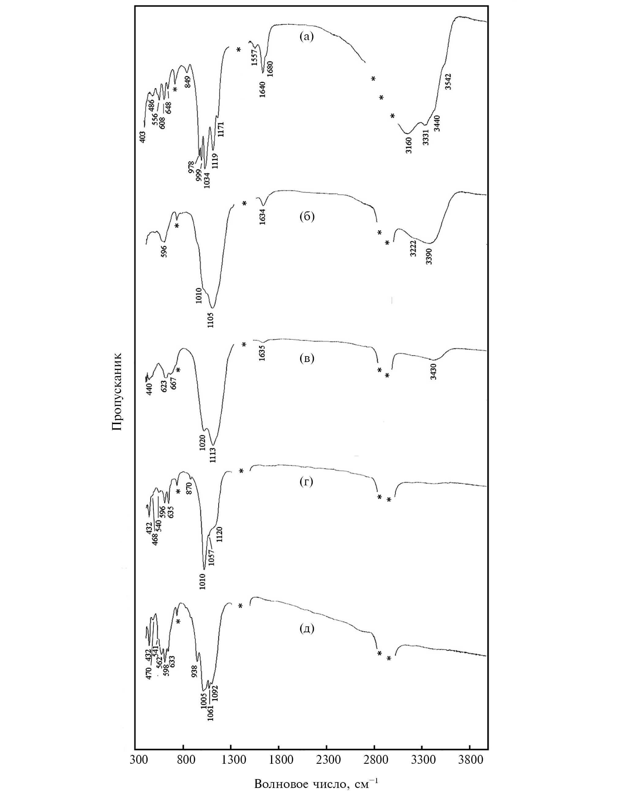 Рис. 1. Спектры инфракрасного поглощения изученного дестинезита (спектральное разрешение 2 см−1): (а) – исходный образец, (б) – образец, нагретый до 170 °С, (в) – до 600 °С, (г) – до 800 °С, (д) – до 1000 °С; * отмечены области полос вазелинового масла.
