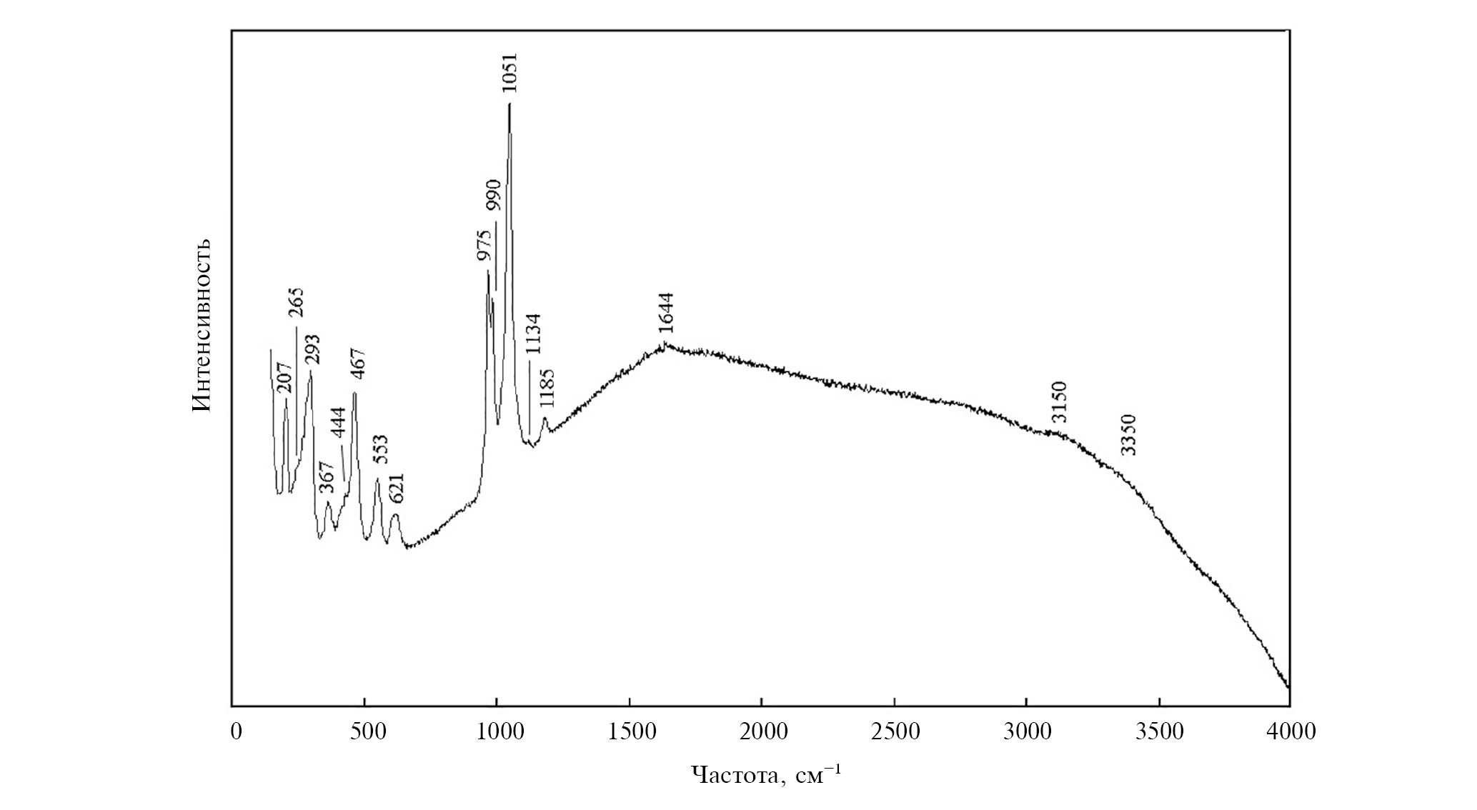 Спектр инфракрасного поглощения изученного минерала (рис. 1а) согласуется со спектром образца № P144 из Богемии, Чехия (Chukanov, 2014) и результатами исследований дестинезита из Бардзских гор, Зап. Судеты, Польша (Koszowska et al., 2005) и из Аржанто, Валлония, Бельгия (Frost, Palmer, 2011а). В высокочастотной области спектра, относящейся к валентным колебаниям связанных с катионами железа гидроксильных групп и ОН-групп молекул воды, зарегистрирована широкая полоса поглощения сложной формы, в профиле которой можно выделить несколько компонент с волновыми числами около 3542, 3440, 3331 и 3160 см–1. Высокочастотная компонента может быть отнесена к валентным колебаниям не входящей в молекулы воды гидроксильной группы (Frost, Palmer, 2011a). Наличие в минерале воды в молекулярной форме подтверждается присутствием в спектре полос поглощения при 1640 см–1 с плечом при 1680 см–1 и значительно более слабой полосы при 1557 см–1, которые соответствуют деформационным колебаниям. Наличие нескольких компонент полосы поглощения свидетельствует о присутствии молекул воды в нескольких структурных позициях (Koszowska et al., 2005; Frost, Palmer, 2011a). Широкая интенсивная полоса поглощения в интервале от 1180 до 900 см–1, состоящая из пяти компонент, относится к валентным колебаниям тетраэдрических анионов [PO4]3– и [SO4]2–. Полосы при 648, 608, 556 и 486 см–1 приписываются деформационным колебаниям этих анионов. Самая низкочастотная полоса поглощения с волновым числом 403 см–1 может являться решеточной модой или соответствовать трансляционным колебаниям катиона железа. Полоса поглощения при 849 см–1 соответствует либрационным колебаниям гидроксильной группы (Koszowska et al., 2005).