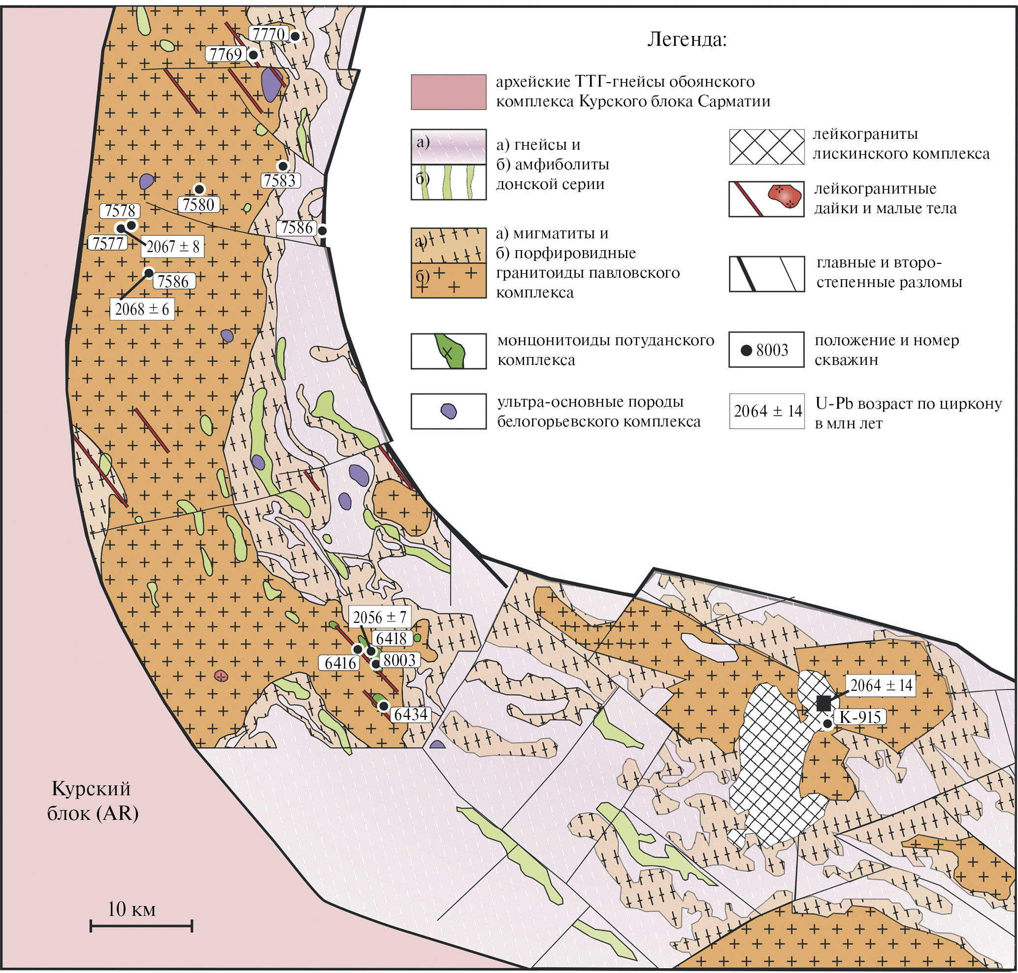 Хохольско-Репьевский батолит вместе с Павловским занимают площадь около 4000 км2 (рис. 1). К павловскому комплексу также относят серию разобщенных массивов в центральной части Донского террейна и Курском блоке (рис. 1). Породы комплекса дифференцированы от кварцевых монцодиоритов до лейкогранитов.