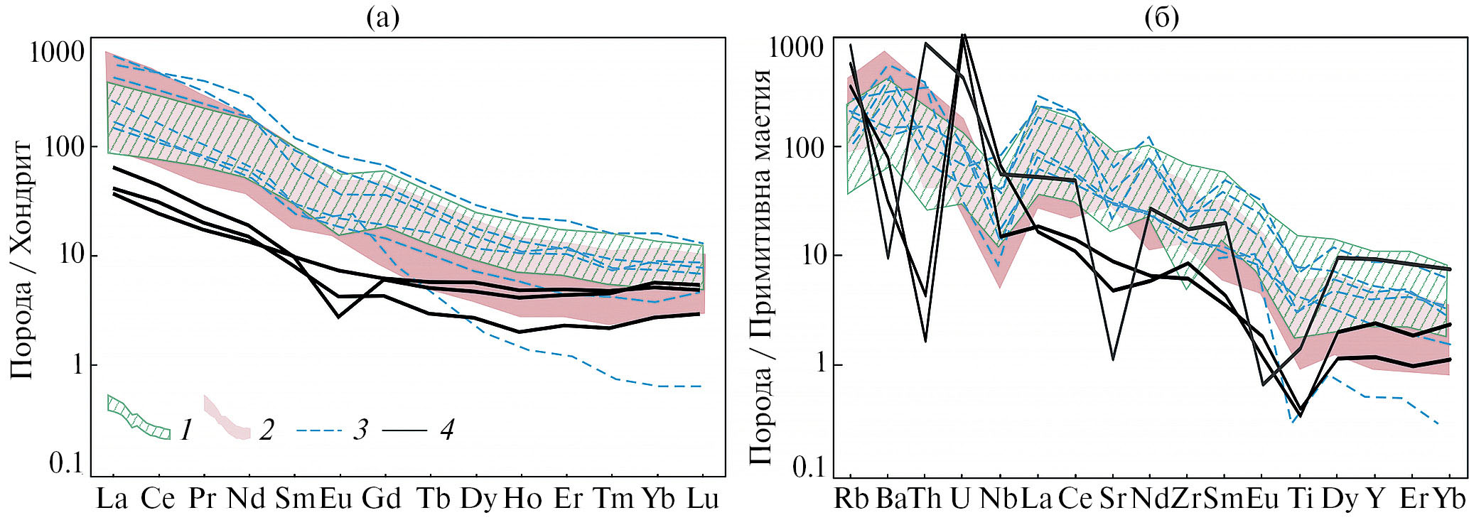 Все три группы пород пространственно сближены, имеют близкий возраст, сходные оценки условий кристаллизации: давление 2.7–3.2 кбар, температуры ликвидуса 1100–980 °C и субликвидуса 800–700 °C (Петракова, Терентьев, 2018). Для них предполагается участие обогащенного гетерогенного источника с высокими содержаниями щелочей, крупноионных литофильных элементов и легких РЗЭ. Вклад мантийной компоненты подтверждается присутствием пород с низким SiO2, повышенными содержаниями MgO, Cr, Ni, Ti, высокими отношениями Sr/Y, (La/Yb)N, (Dy/Yb)N, указывающими на глубинное происхождение магм и высокими температурами кристаллизации (Петракова и др., 2022 а).