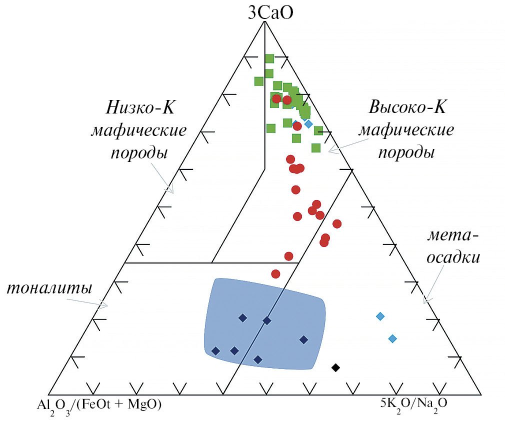 Рис. 9. Al2O3/(FeOt+MgO) — 3CaO — 5K2O/Na2O диаграмма, характеризующая источники по (Laurent et al., 2014), обозначения как на рис. 4.