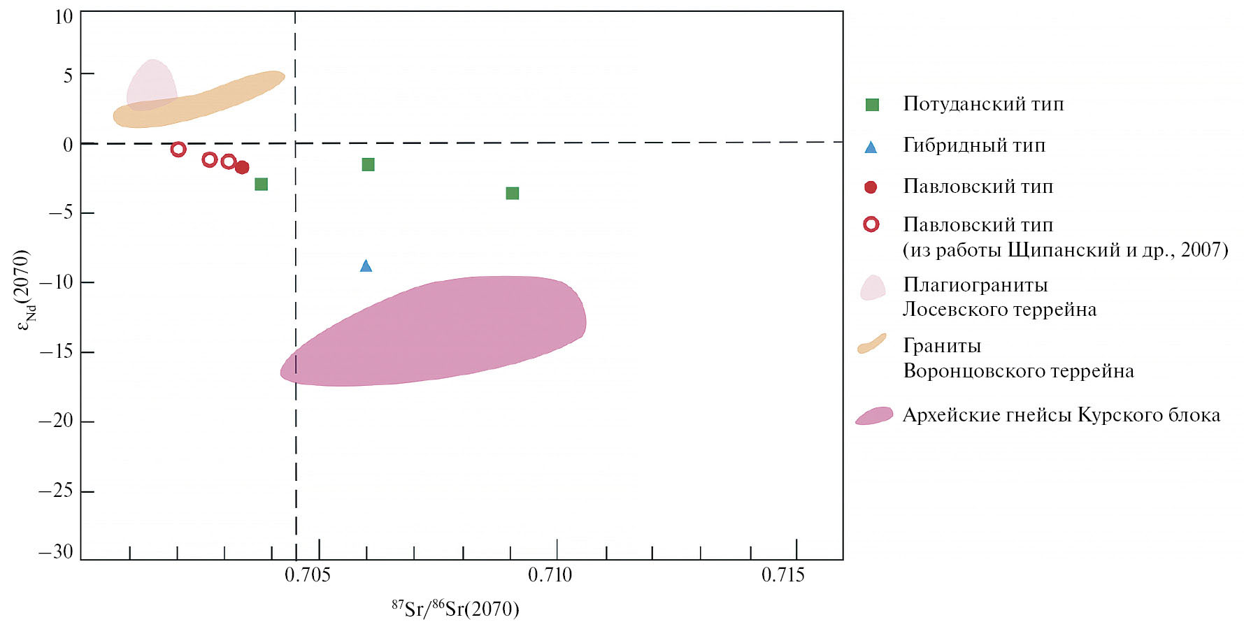 Сдвиг в изотопном составе Nd в более радиогенную область в диоритах потуданского типа северных массивов батолита (скв. 7577), а также их менее железистый состав, по сравнению с петротипичными породами плутона Потудань, может свидетельствовать о возможном участии магмы павловского типа с более радиогенным изотопным составом Nd. В образовании лейкогранитных даек и части гибридных пород участвовали выплавки из архейской коры Курского блока.