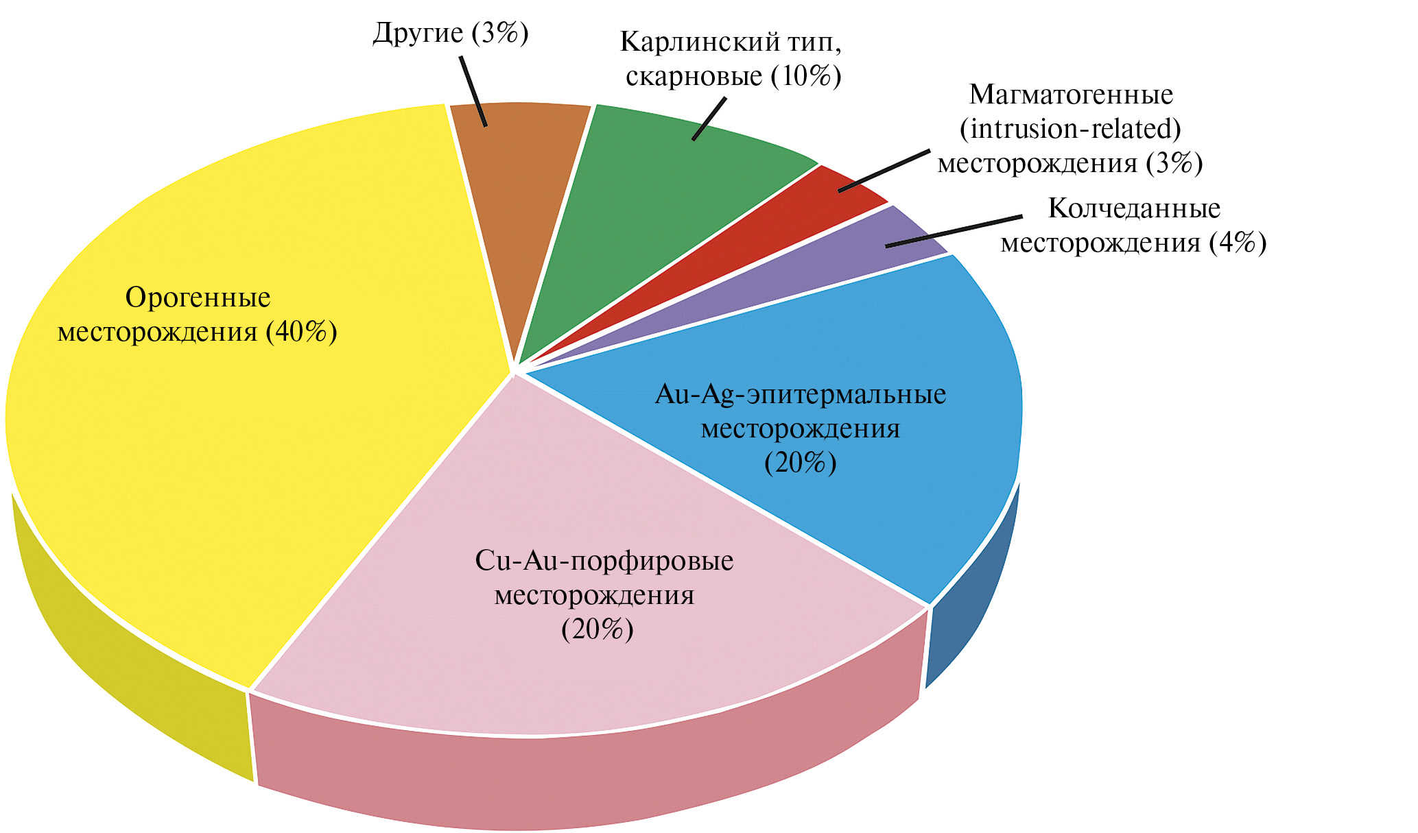 Рис. 1. На диаграмме приведены оценки вкладов в общемировую добычу золота разных геолого-промышленных типов месторождений. Данные заимствованы из работ (Frimmel, 2008; Phillips 2013; Lipson, 2014; Goldfarb et al., 2014) без учета вклада россыпных месторождений и месторождения Витватерсранд (ЮАР).