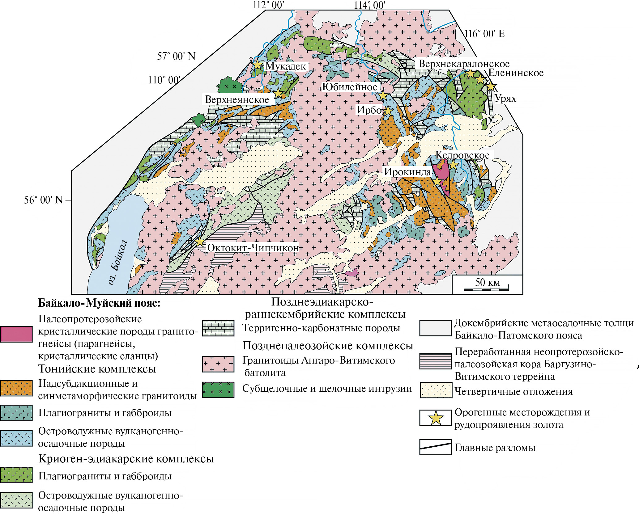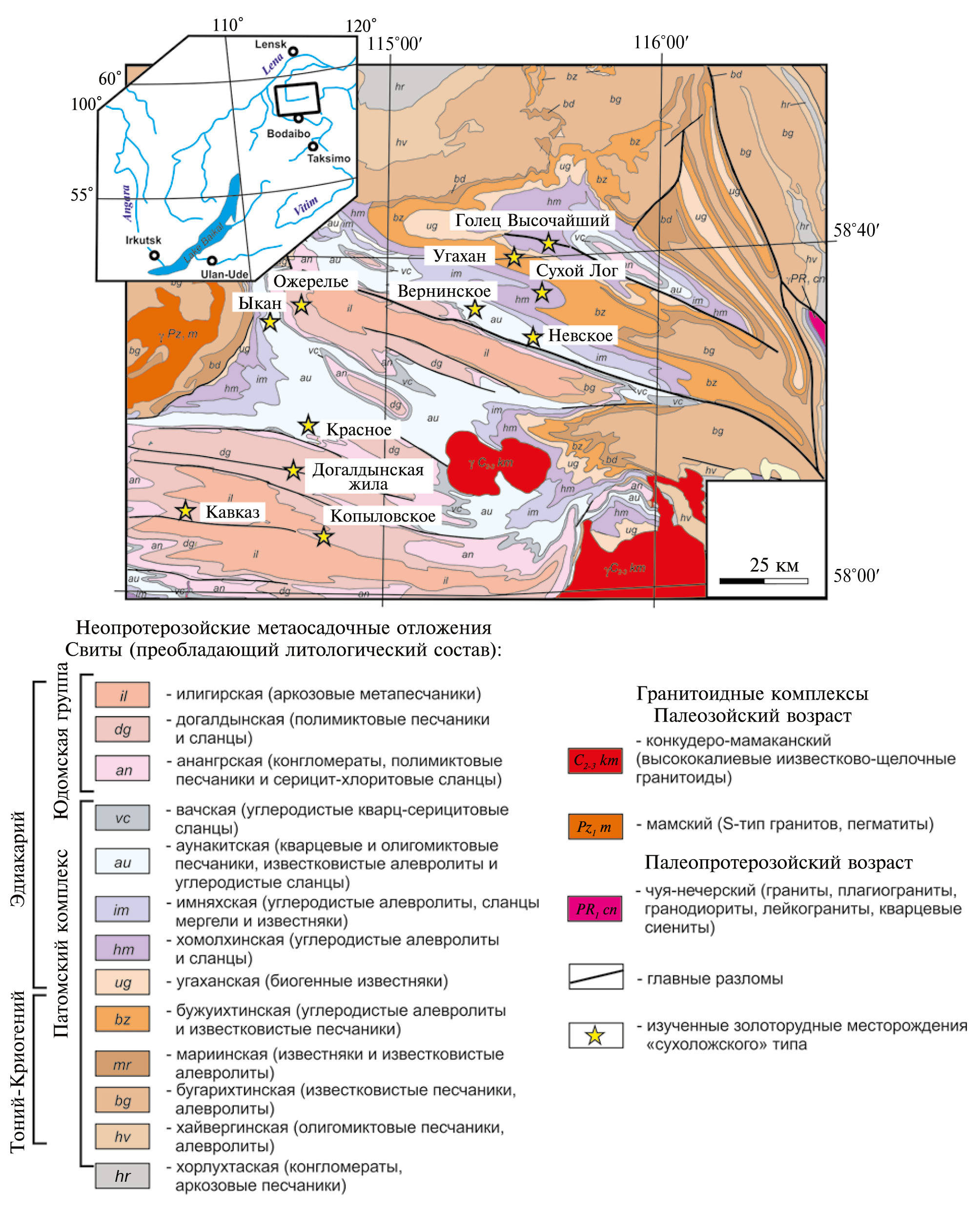 Золоторудные месторождения орогенного типа локализованы в пределах двух крупных структурных зон южного обрамления Сибирской платформы: Байкало-Патомского и Байкало-Муйского складчатых поясов (рис. 4). Байкало-Патомский пояс (БПП) расположен на южной окраине Сибирского кратона. Он образован сложно деформированными и метаморфизованными осадочными комплексами. С запада, севера и востока Байкало-Патомский пояс отделен от Сибирской платформы системой глубинных разломов, представленных преимущественно надвигами с северной вергентностью. Южной границей БПП является неопротерозойская сутурная зона, отделяющая его от структур Байкало-Муйский складчатого пояса (Зоненшайн и др., 1990; Гусев, Хаин, 1995; Зорин и др., 1997, 2009; Хоментовский, Постников, 2001; Гордиенко, 2006; Кузмин и др., 2006; Немеров и др., 2010; Станевич и др., 2010; Юдовская и др., 2011; Гладкочуб и др., 2013; Powerman et al., 2015; Чугаев и др., 2017а, 2018).