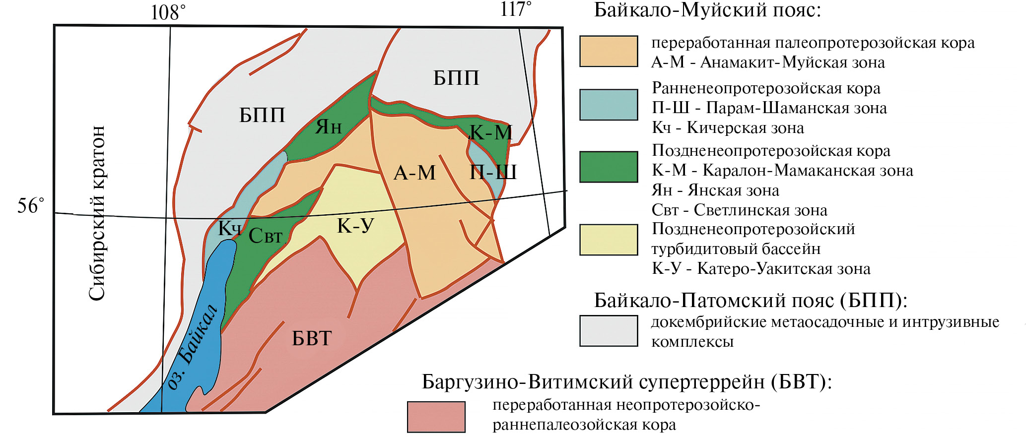 Байкало-Муйский пояс представляет собой коллаж из разнородных блоков протерозойской коры, интенсивно переработанной в каледонский и герцинский этапы формирования ЦАОП. В строении БМП выделяется несколько структурно-формационных зон, формирование которых связывают с раннебайкальским (тонийская эпоха) и позднебайкальским (криогений и эдиакарская эпохи) тектоническими циклами (Рыцк и др., 2007а; Ярмолюк и др., 2012; Kröner et al., 2014; Ярмолюк, Дектярев, 2019) (рис. 8). К раннебайкальским структурам отнесены Анамакит-Муйская, Кичерская, Светлинская и Парам-Шаманская зоны, тогда как к позднебайкальским — Каралон-Мамаканская, Янская и Катеро-Уакитская. Современный структурный облик БМП в значительной степени сложился в позднеэдиакарское время (630–620 млн лет назад) в результате аккреции раннебайкальских и позднебайкальских тектонических блоков, которая сопровождалась развитием метаморфизма высоких степеней (Шатский и др., 2012; Skuzovatov et al., 2019).