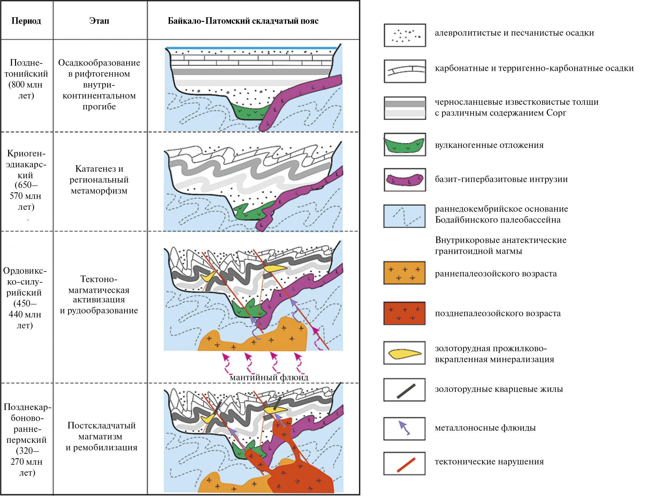 Обобщение результатов геохронологических исследований различных метаморфических пород и синметаморфичеких гранитоидов БМП и БПП (Виноградов и др., 1996; Амелин и др., 2000; Зорин и др., 2008; Meffre et al., 2008; Юдовская и др., 2011; Рыцк и др., 2011; Шацкий и др., 2012; Yudovskaya et al., 2016; Palenova et al., 2019; Skuzovatov et al., 2019; Чугаев и др., 2019а) позволяет выделить несколько пиков прогрессивного регионального метаморфизма, проявившихся в неопротерозойско-палеозойский период. Наиболее ранний этап метаморфизма приходится на вторую половину (800–780 млн лет назад) тонийского времени и фиксируется по становлению гранито-гнейсов илеирского комплекса в БМП. По своим условиям в центральных зонах он отвечал амфиболитовой фации, тогда как по периферии — зеленосланцевой фации метаморфизма (Неелов и др., 1987). Метаморфизм более высоких ступеней, устанавливаемый по присутствию в Анамакит-Муйской зоне БМП эклогитов и гранатсодержащих гнейсов, приходится на эдиакарское время (620–610 млн лет назад) и связан с финальным этапом аккреции блоков раннебайкальской и позднебайкальской континентальной коры БМП (Рыцк и др., 2011; Skuzovatov et al., 2019).