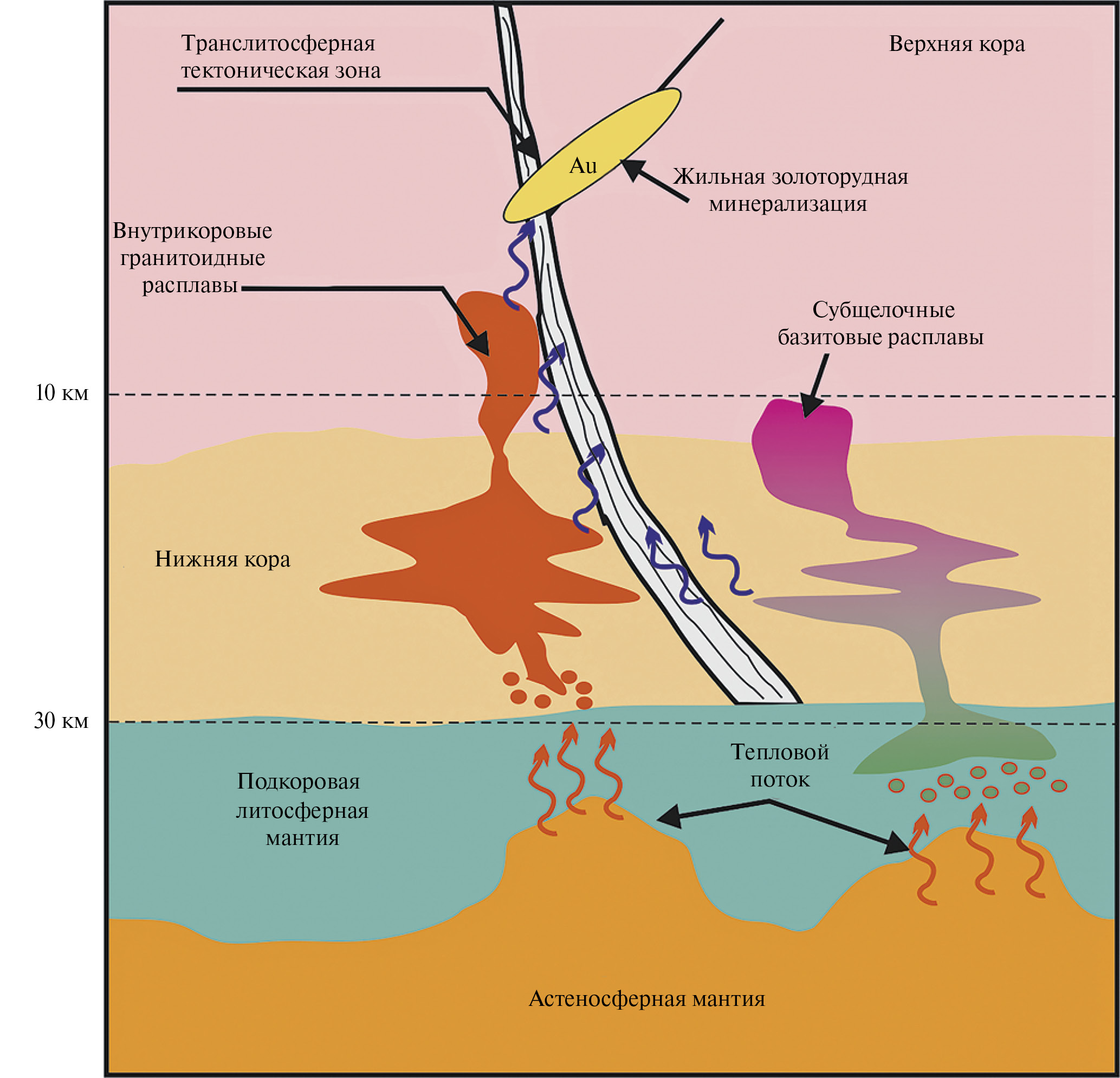 Рис. 3. Схема формирования орогенных золоторудных месторождений согласно магматогенной концепции. Составлена по (Hronsky et al., 2012; de Boorder, 2012; Goldfarb et al., 2023) с изменениями.