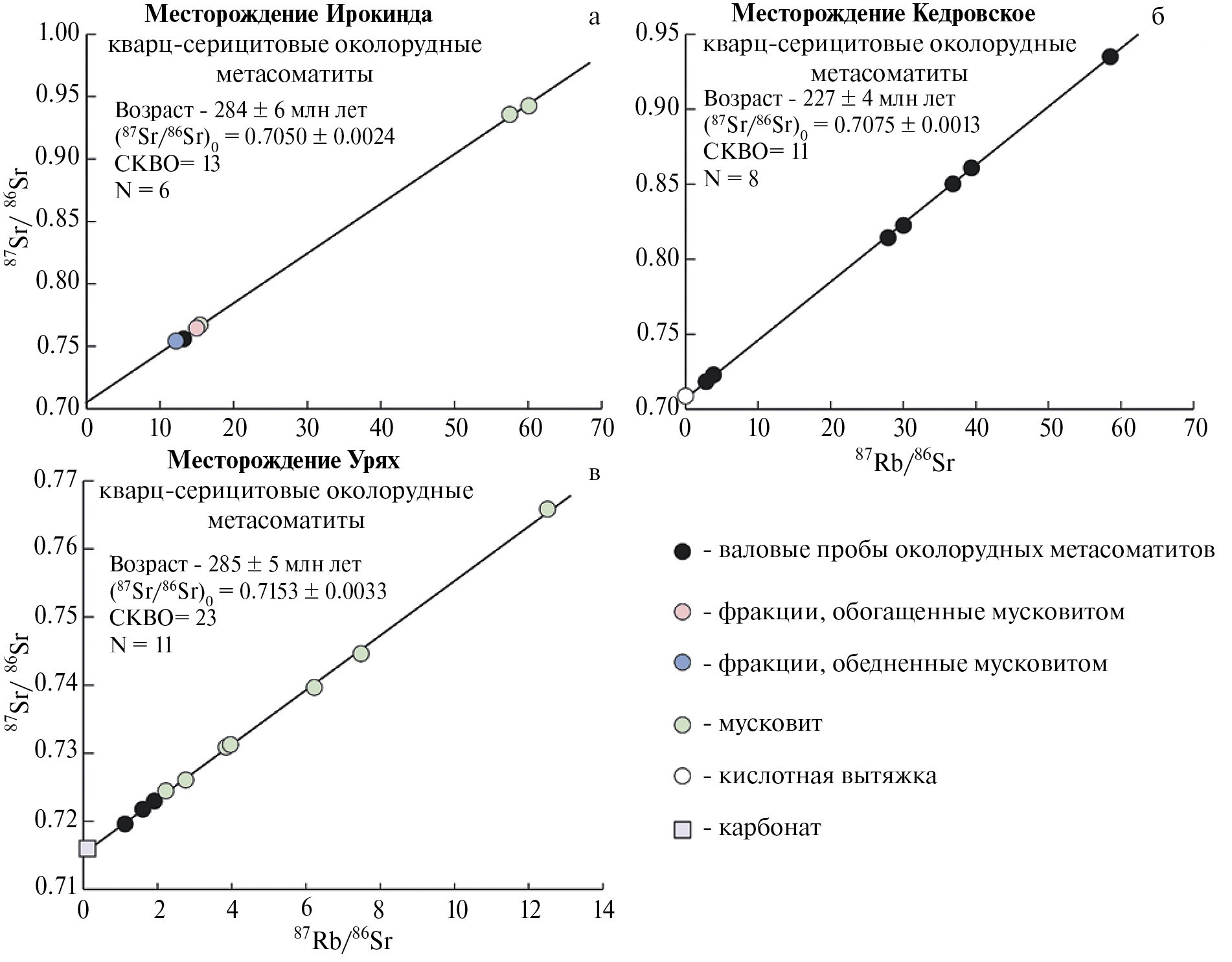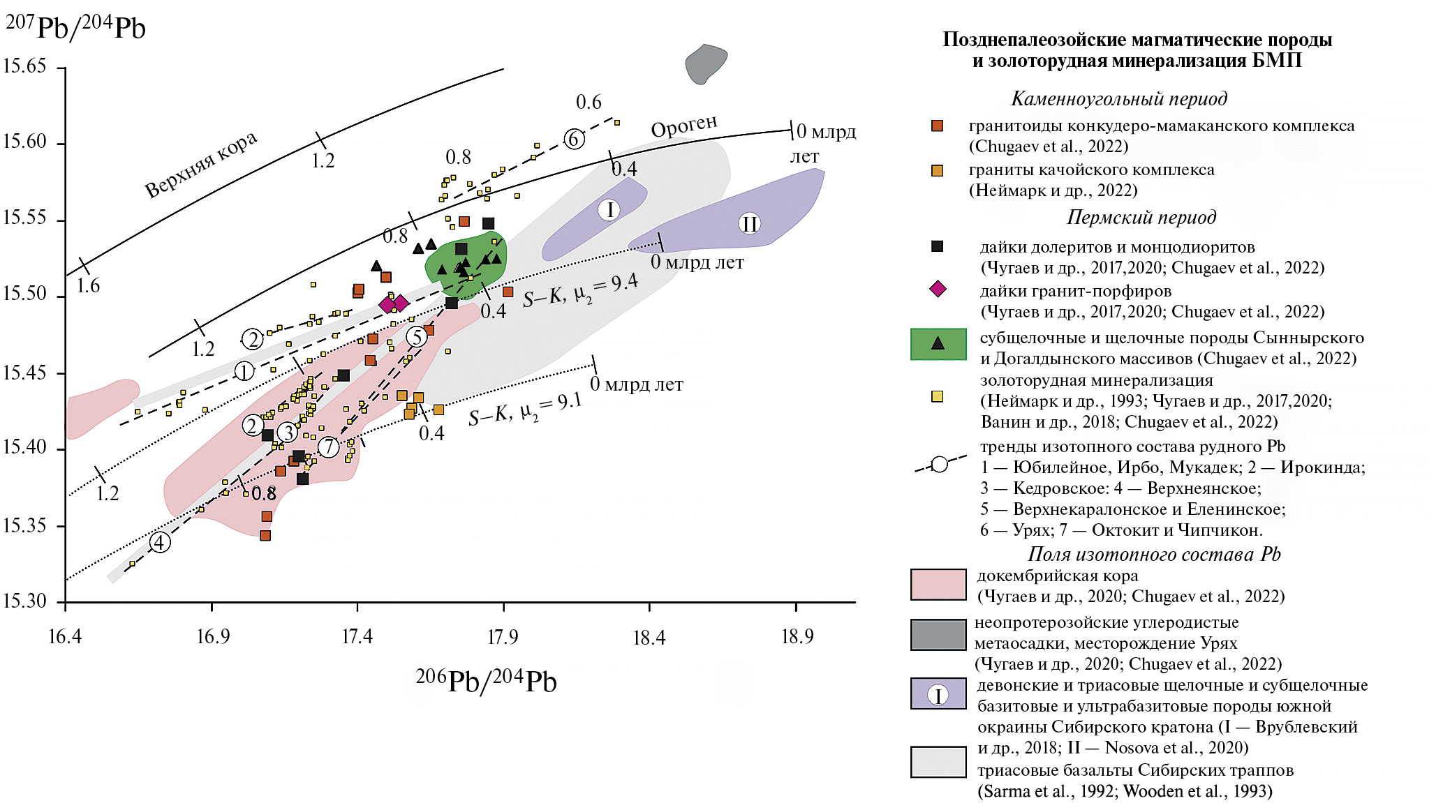 В Бодайбинской зоне их выходы расположены вдоль ее южной и западной границы (рис. 7). Среди палеозойских магматических образований, присутствующих в Бодайбинской зоне, традиционно выделяют несколько комплексов (Государственная геологическая карта…, 2010). К наиболее ранним относят пегматоидные граниты и пегматиты мамского комплекса, которые преимущественно распространены в юго-западной и западной частях региона в бассейнах рек бассейнах Чуя и Большой Патом. Ими сформированы разные по площади (вплоть до 45 км2) массивы, а также небольшие тела и жилы. Породы, главным образом, представлены мусковитовыми и биотитовыми плагиогранитами и плагиопегматитами, нередко содержащими гранат. Для них характерно гнейсовидные текстуры. В экзоконтактах изменения вмещающих метаосадочных толщ, как правило, отсутствуют. Геологические и геохимические особенности гранитоидов мамского комплекса, по мнению (Макагон, 1977; Зорин и др., 2008), указывают на то, что их формирование происходило синхронно с процессами регионального метаморфизма и складчатыми деформациями. Имеющиеся геохронологические Rb-Sr и U-Pb данные свидетельствуют в пользу позднеордовикско-раннесилурийского (450–420 млн лет) возраста гранитоидов (Государственная геологическая карта…, 2012; Зорин и др., 2008). Опубликованы также и более молодые (~320–300 млн лет) K-Ar, Rb-Sr и 40Ar-39Ar датировки, полученные по слюдам (Неймарк и др., 1993; Государственная геологическая карта…, 2012; Chugaev et al., 2022а). Наличие «омоложенных» возрастов большинство исследователей связывают с нарушением замкнутости Rb-Sr и K-Ar изотопных систем под воздействием термального события, имевшего место в регионе в герцинское время.