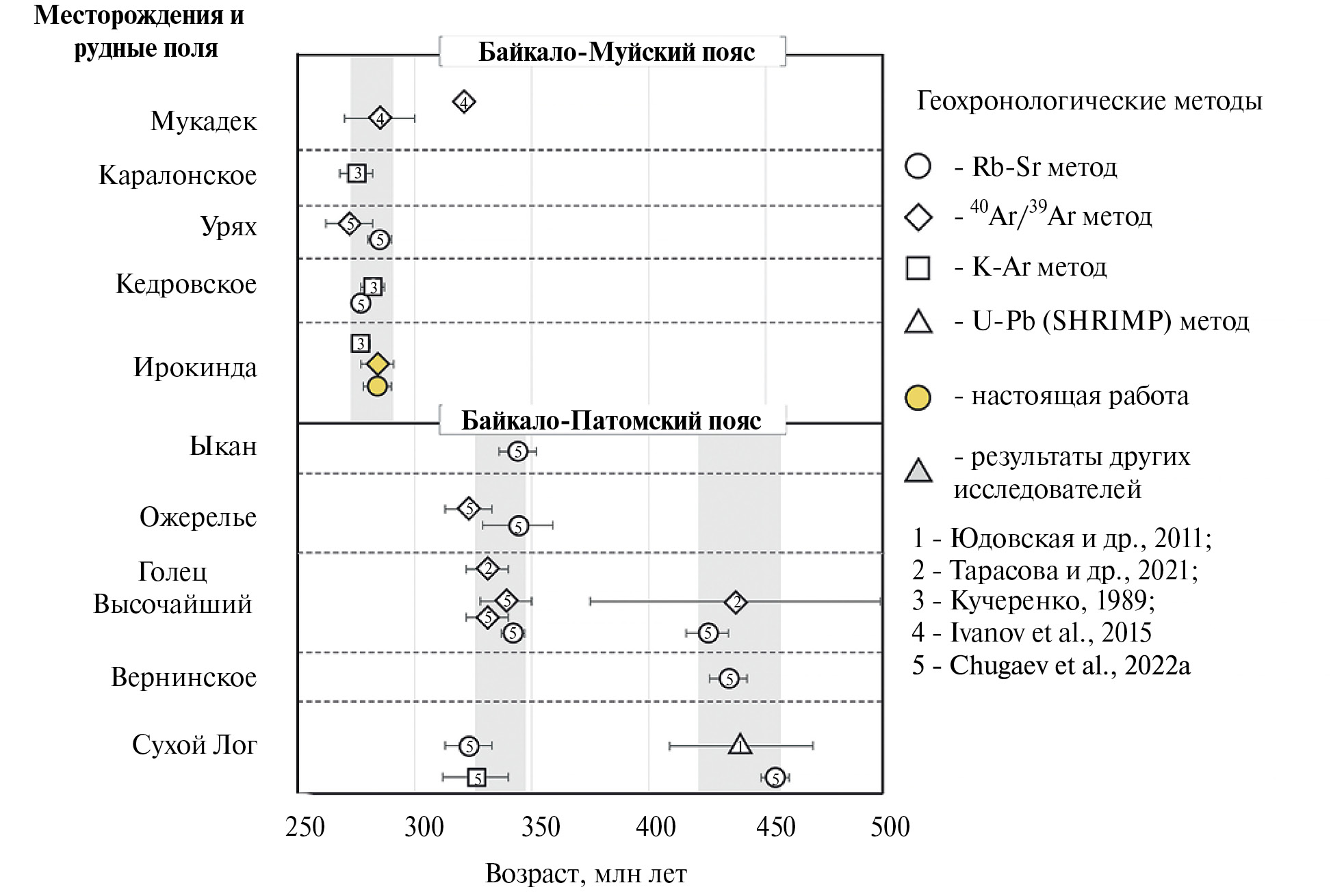 - Sorokin A.A., Zaika V.A., Kadashnikova A.Y., Ponomarchuk A.V., Travin A.V., Ponomarchuk V.A., Buchko I.V. (2023) Mesozoic thermal events and related gold mineralization in the еastern Mongol-Okhotsk Orogenic Belt: constraints from regional geology and 40Ar/39Ar dating. Int. Geol. Rev. 65 (9), 1476–1499.