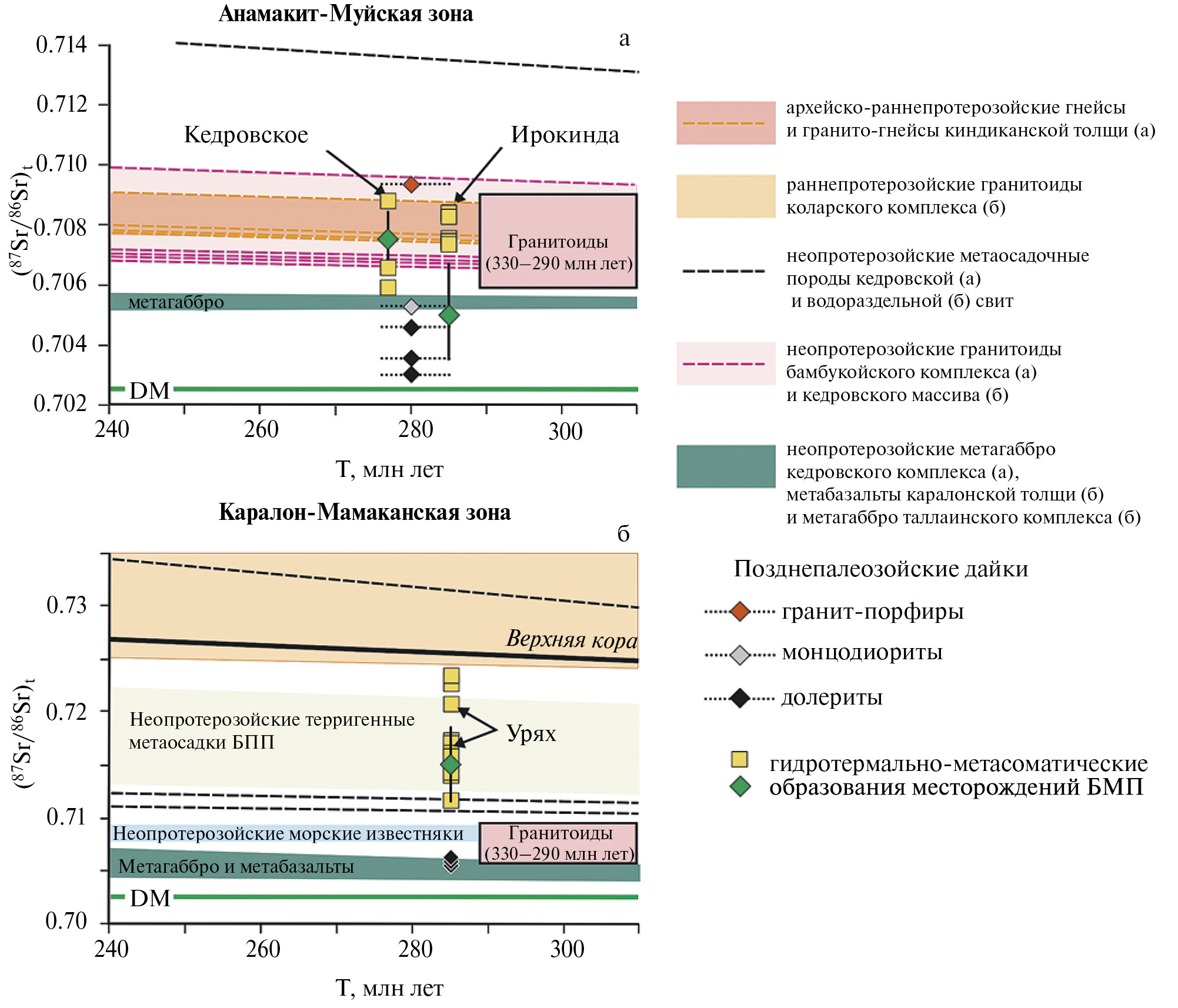 К наиболее древним образованиям отнесены метаморфические породы (гнейсами, гранитогнейсами, кристаллическими сланцами, кальцифиры) киндиканской толщи и джалтукской серии, выходы которых присутствуют в восточной части (Муйская подзона) Анамакит-Муйской зоны (рис. 9). Они формируют относительно крупные тектонические структуры, известные как Северо-Муйскую и Южно-Муйскую глыбы. Традиционно они рассматриваются исследователями региона как выходы раннедокембрийского фундамента древнего кратона. Однако в работе (Зорин и др., 2009) высказано также предположение, что это основание (цоколь) позднепротерозойской островной дуги. Следует отметить, что возраст этих пород на основании геологических данных принимается как позднеархейско(?)-раннепротерозойский. Имеющиеся единичные Nd-модельные оценки указывают на раннепротерозойский возраст субстрата, по которому сформированы эти метаморфические породы (Рыцк и др., 2011; Чугаев и др., 2020). С этими оценками согласуются наши (неопубликованные) U-Pb исследования акцессорных цирконов в палеозойских риолитовых дайках, прорывающих гнейсы киндиканской толщи в пределах Южно-Муйской глыбы. Они дали максимальные значения возраста в 1.9–1.8 млрд лет, который можно рассматривать как нижнюю возрастную границу для пород киндиканской толщи. Кроме того, непосредственное U-Pb геохронологическое исследование цирконов из гнейсов киндиканской толщи показали, что в их состав могли быть ошибочно включены породы тонийского возраста.