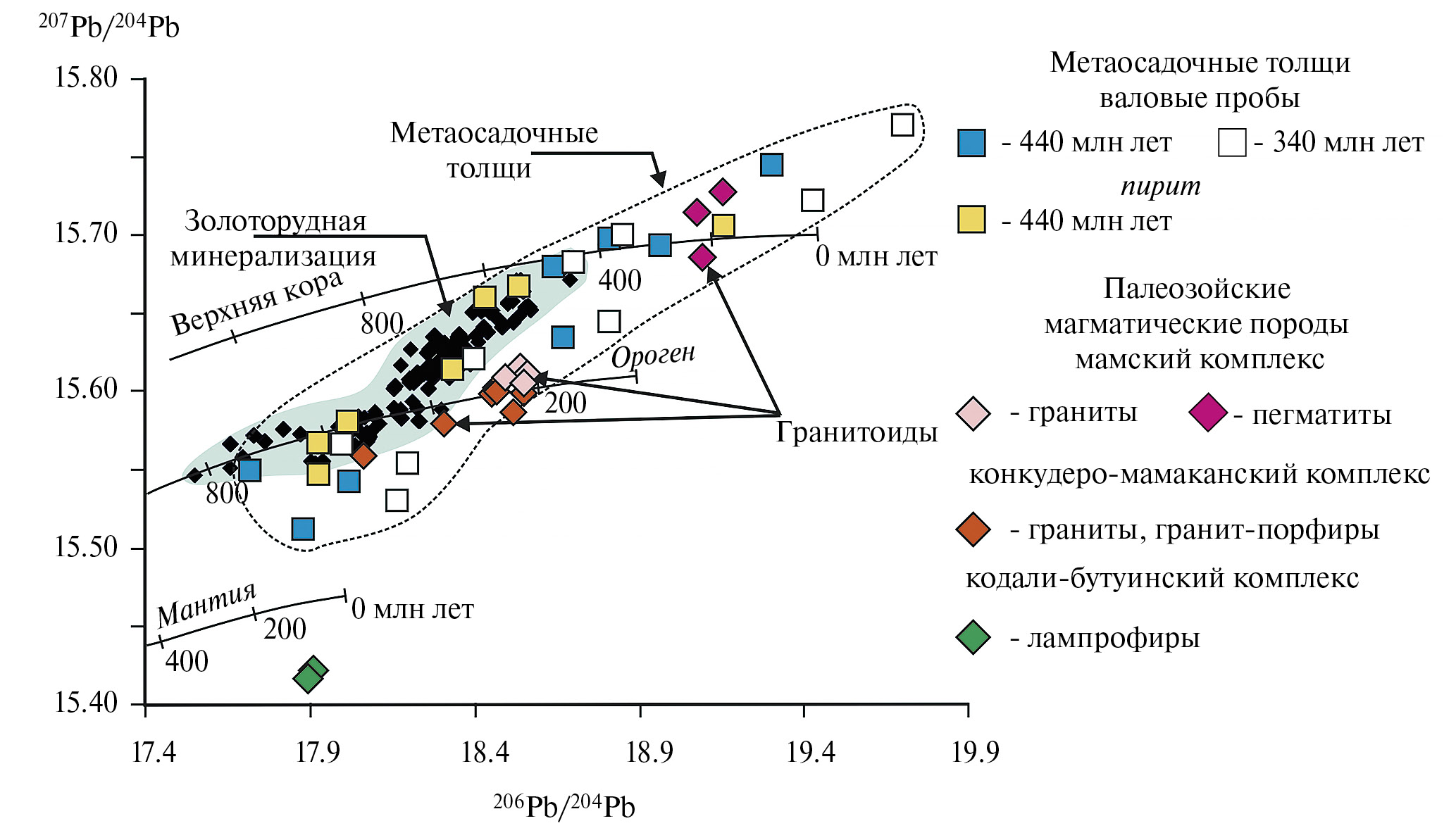 Концепция метаморфогенного происхождения орогенных месторождений золота доминировала в рудной геологии на протяжении почти 20 лет. Однако в последнее время отмечается существенный сдвиг в сторону магматогенно-гидротермальной модели. Это выражается, с одной стороны, в том, что ряд месторождений, классифицируемых ранее как орогенные, в последнее время были отнесены к intrusion related типу (например, упомянутое выше месторождение Дарасун), или их метаморфогенное происхождение (например, Голден Майл (Австралия), Цзяодун (Китай), Хоумстейк (США)) результате новых исследований было поставлено под сомнение (de Booder, 2012; Sillitoe, 2020). Так, для суперкрупного месторождения Хоумстейк на основе комплекса новых геохронологических и изотопно-геохимических данных (в первую очередь, результатов изучение изотопного состава Pb) были показаны синхронность развития магматизма и рудообразования, а также участие магматического источника в его генезисе (Frei et al., 2009). Во-вторых, существует целый ряд геологических фактов, которые затруднительно объяснить в рамках метаморфогенной концепции. К их числу относится пространственная и временная сопряженность золоторудной минерализации месторождений орогенных поясов с лампрофировыми и гранит-порфировыми телами, что неоднократно было отмечено исследователями (McNeil, Kerrich, 1986; Rock et al., 1987; Robert, 2001; Бортников, 2006; Mao et al., 2008; Vielreicher et al., 2010; de Boorder, 2012). Кроме того, для некоторых золоторудных провинций мира (например, Цзяодунская провинция (Китай), Варисциды (Центральная Европа)) существует значительный (в десятки — сотни миллионов лет) разрыв между возрастом золоторудной минерализации и пиком регионального метаморфизма, что, по мнению некоторых исследователей, свидетельствует о генетической связи рудообразования с глубинными магматическими процессами (Mao et al., 2008; de Boorder, 2012; Hronsky et al., 2012). Кроме того, ряд месторождений (например, Mouther Lode, Мурунтау), отнесенные к орогенному типу (Goldfarb et al., 2001), обладают повышенными содержаниями таких элементов как Pb, Zn, W, Bi и Te (Weir et al., 1987; Kempe et al., 2001), что сближает их с месторождениями, образование которых связано с магматогенными гидротермальными системами (Sillitoe, 2020).