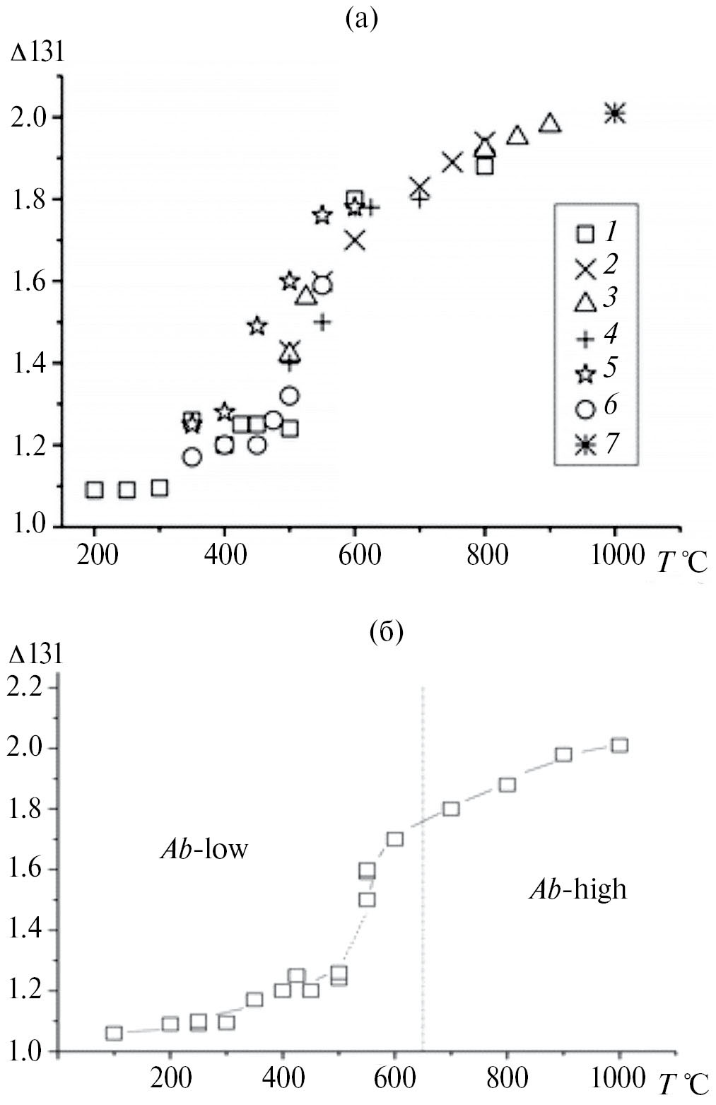 Рис. 1. Упорядочение альбита в зависимости от температуры, по данным различных работ (номера точек соответствуют номерам в табл. 1) (а); структурный переход высокий-низкий альбит по данным работы (Сендеров, Щекина, 1976) (б).