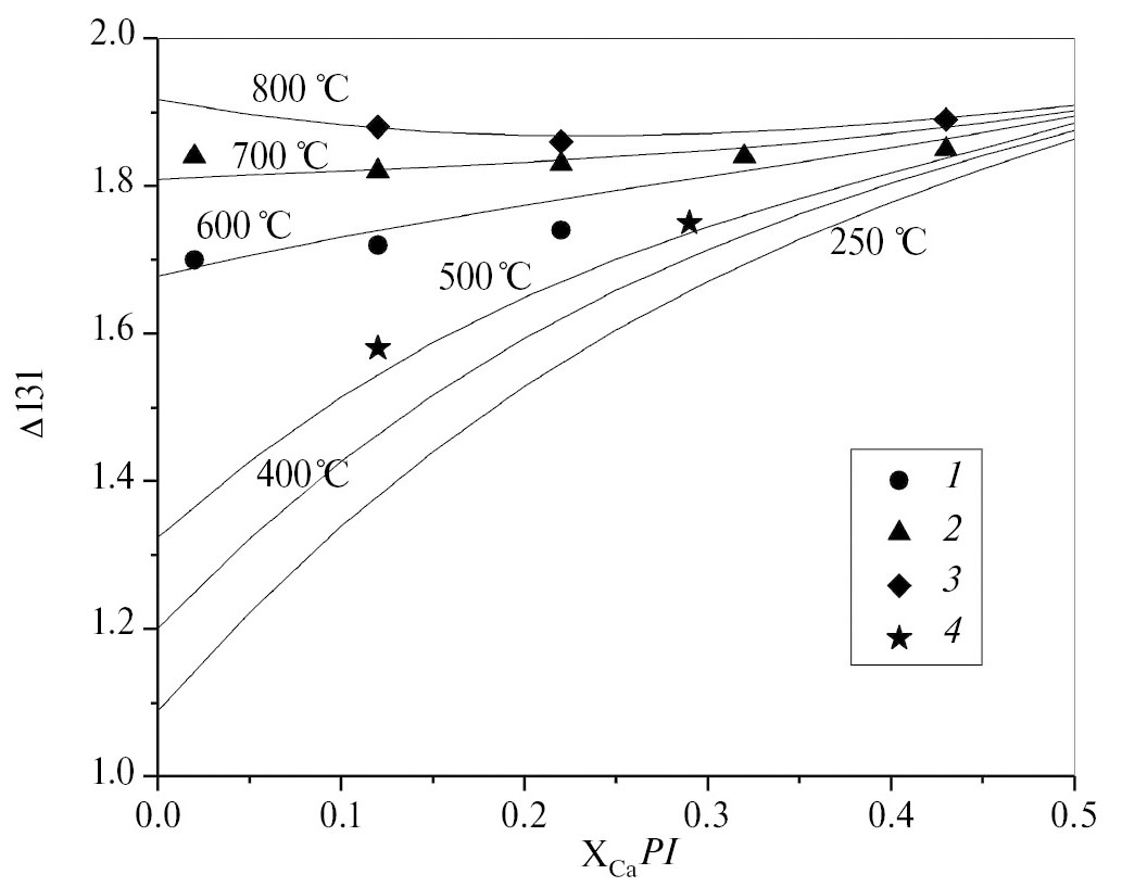 На рис. 2 приведена диаграмма состав плагиоклазов — параметр Δ131 (Cu-Kα1) для оценки температуры по степени упорядочения полевых шпатов. Для оценки температуры по величине Δ131 (Cu-Kα1) были использованы уравнения вида: