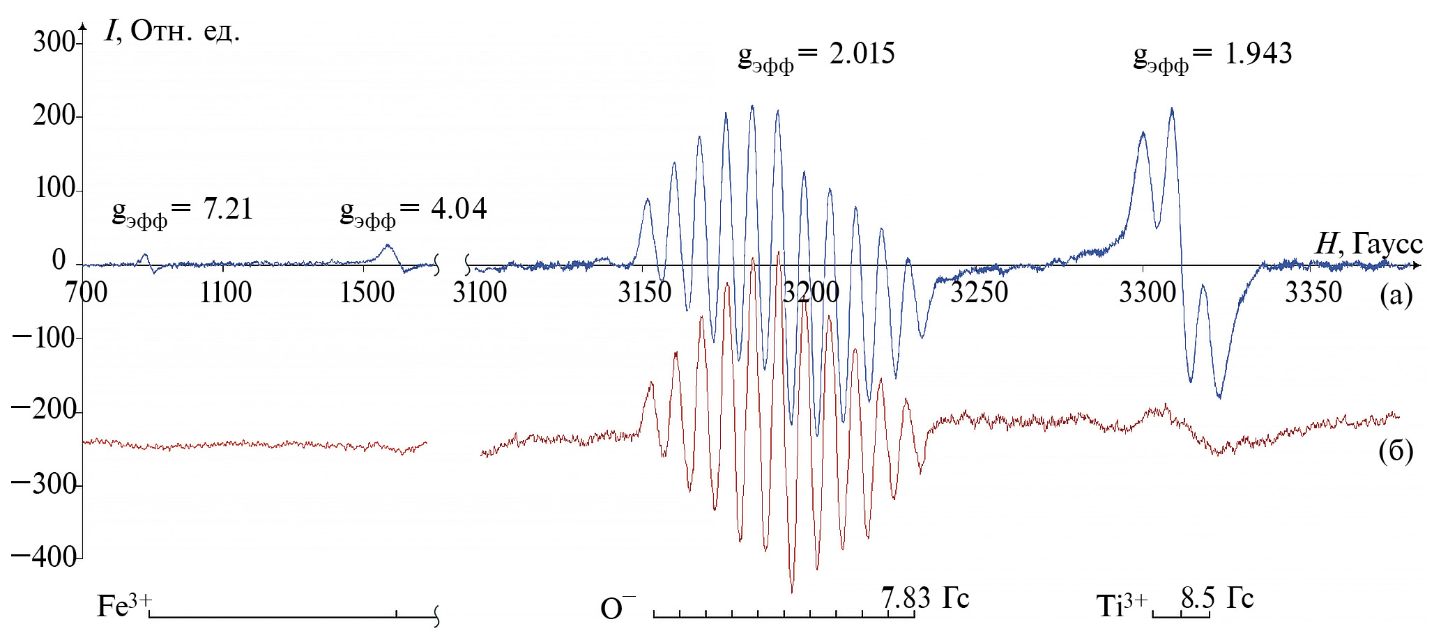 Рассчитанные нами g-факторы этих двух парамагнитных центров (для использованной при съемке ориентации кристаллов H||b) близки к значениям, определённым в работе (Toledo et al., 2020): gyy = 2.0075(2) для O– центра и gyy = 1.9386(1) для Ti3+ центра.